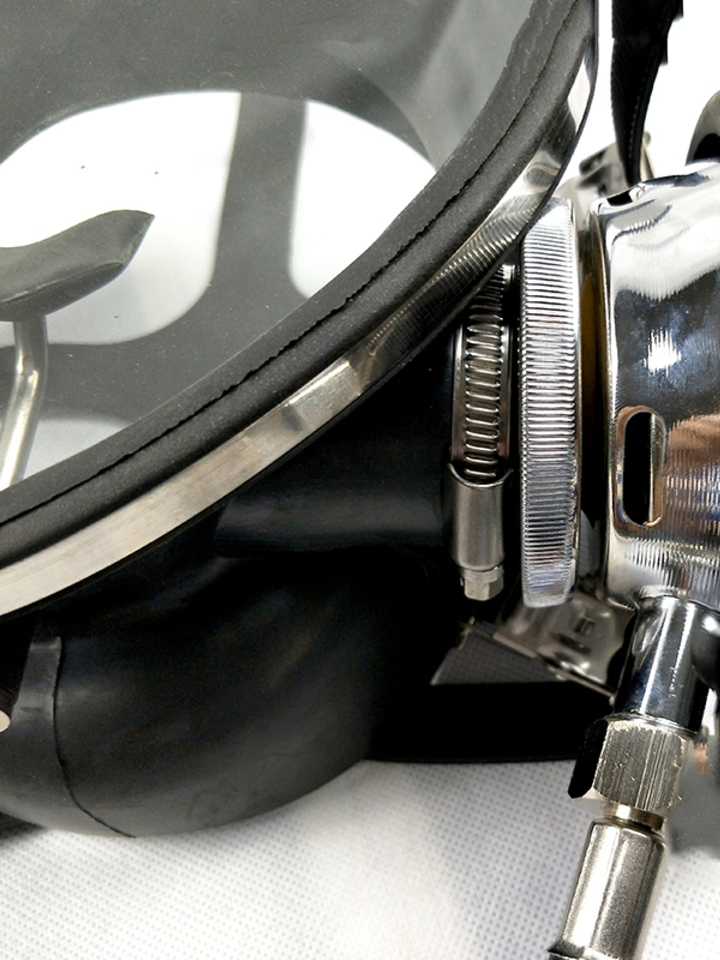 左侧下方开口与二级减压器连接,呼吸气体从此口出入,五点卡扣设计,能够固定头部,防止松动
