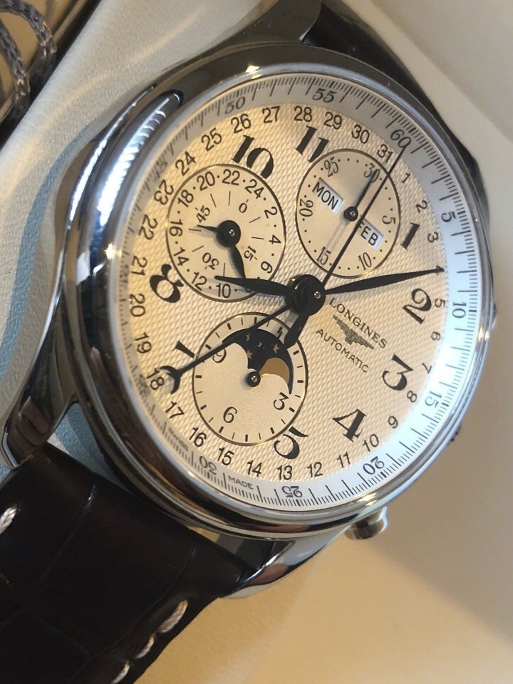 浪琴这款名匠系列月相腕表L2.673.4.78.3是整个名匠大家族中机芯结构最为复杂、零件最多、功能也最多的一款。除了普通腕表应该具备的时、分、秒显示之外,它还有:多功能计时(具备30分钟累加和12小时累加)+24小时显示+日期、月份、星期显示+月相显示,成为畅行全球24个时区的旅行商务腕表。