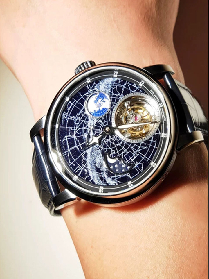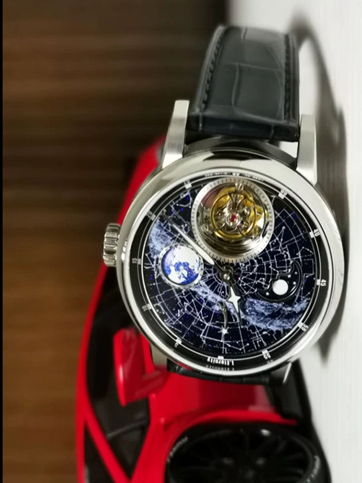 多功能机械腕表,瑞士原产机械机芯,走时精准,自动上链,使用省心,表盘镂空陀飞轮设计。