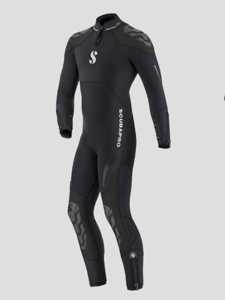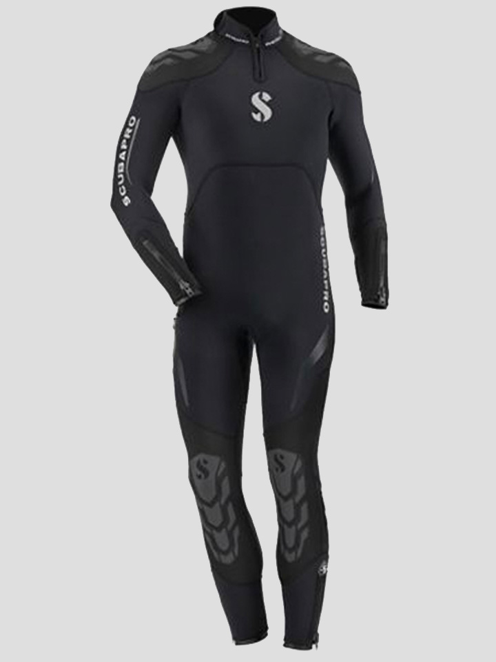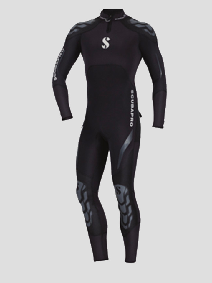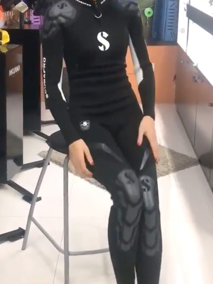 本款潜水服100%由氯丁橡胶制成,防水性能佳,穿着自由度高。两腿膝盖大范围防摩擦设计,安全性能高。