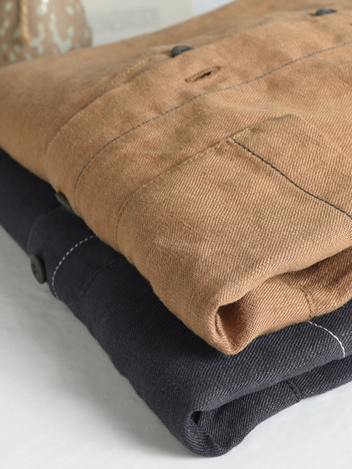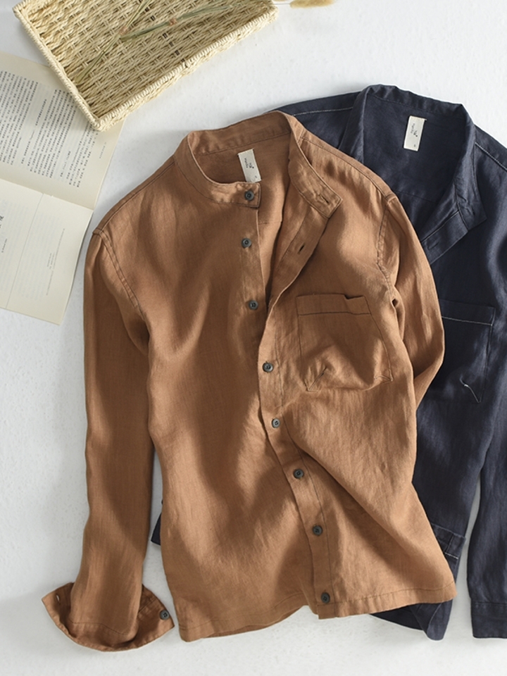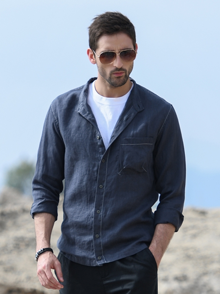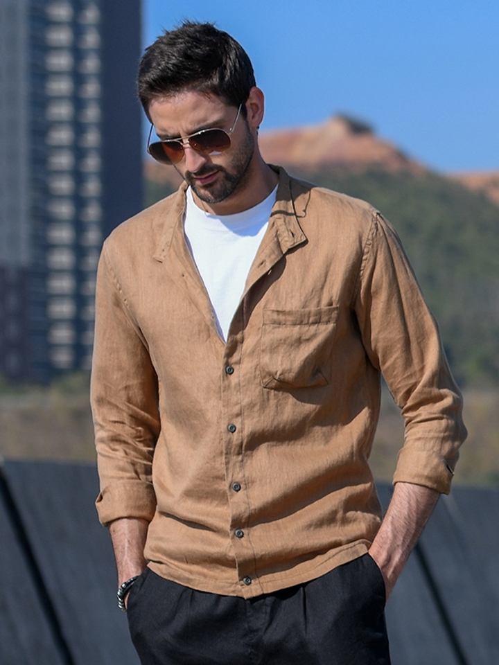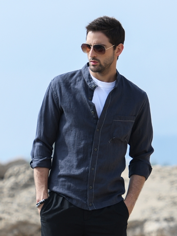 文艺复古范儿的一款男士长袖衬衫,质感亚麻面料,搭配微宽松版型,可方领可立领,休闲随性。