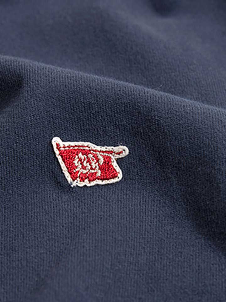 宽松舒适的版型设计,尽显休闲慵懒风。深蓝的设计搭配红旗的标志。尽显复古气息。简约而不简单的风格。