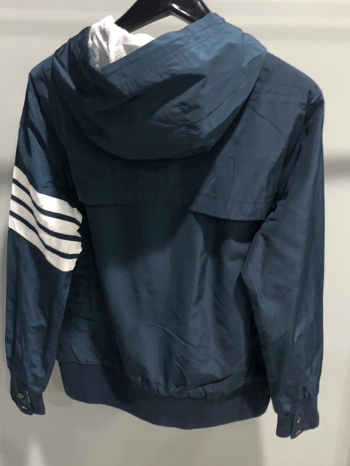 宽松的版型,活动更自由舒适,经典的连帽设计,穿上身更显简约和休闲。衣袖融入了撞色四道杠的处理,增添衣身的层次感。