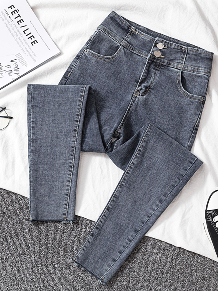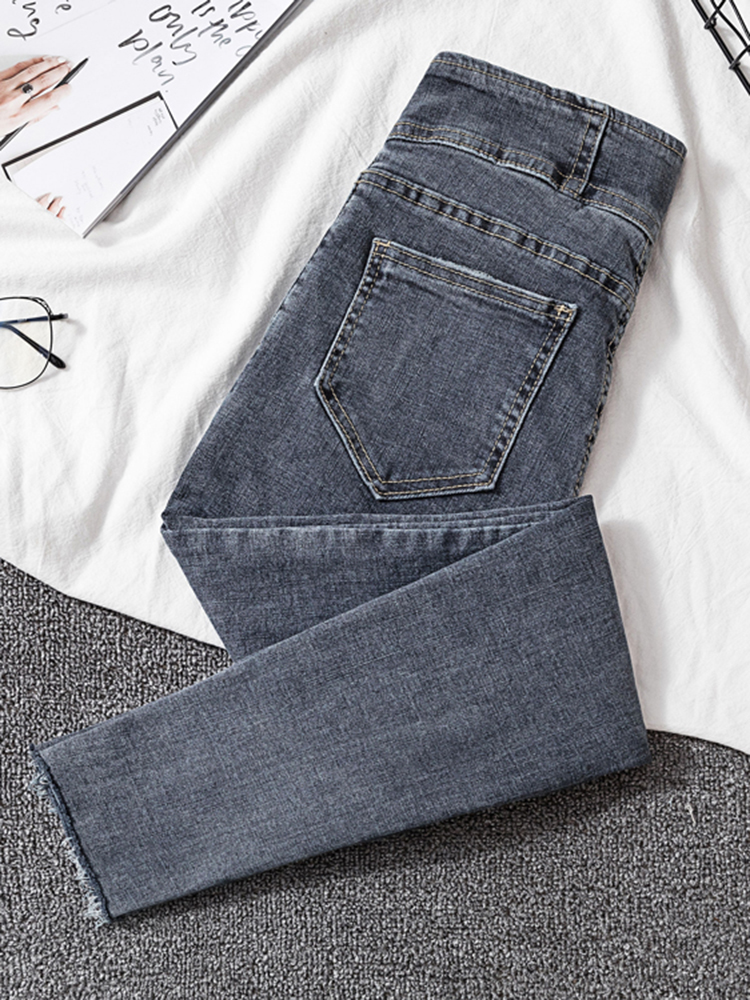 一年四季不过时的牛仔裤,高腰排扣的设计,几何的后贴袋。