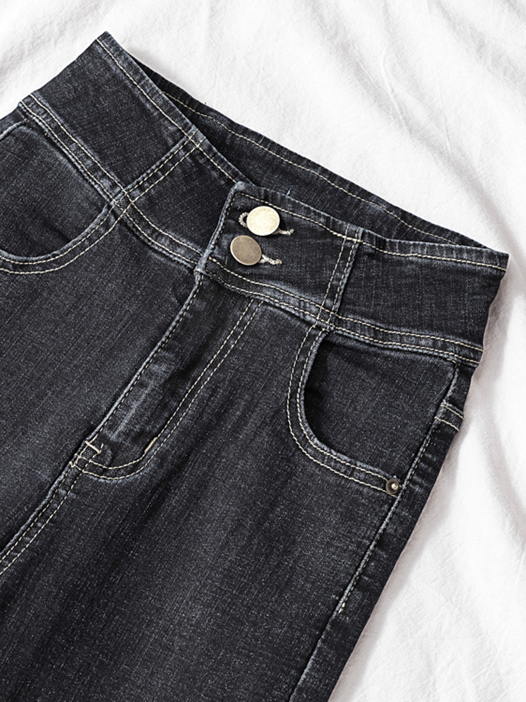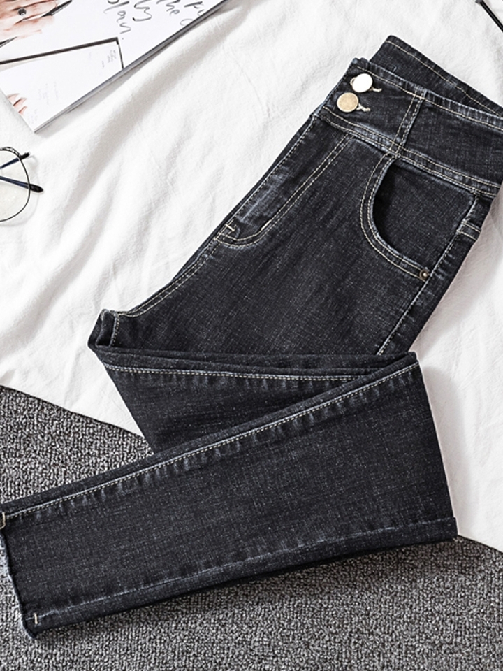 高腰设计,拉长身材比例。高腰牛仔裤,显瘦显腿长。直筒裤型,修饰腿部线条。