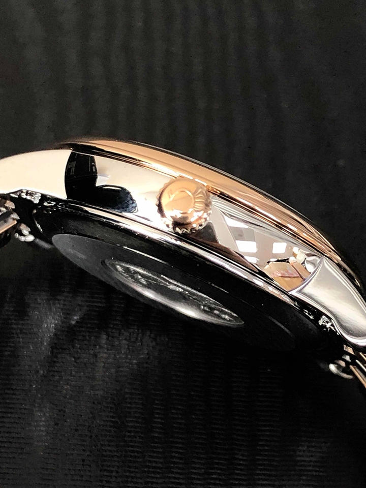 此款机械表表圈与表带间镀黄金色,释放出一丝丝高贵典雅的气息;圆形的表盘设计,更是衬托出迷人的手腕曲线。