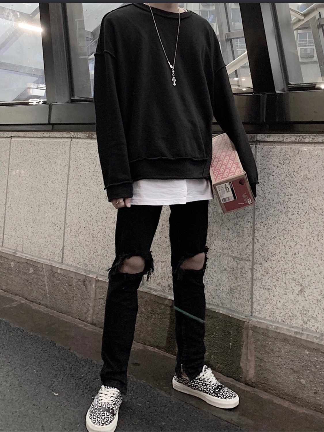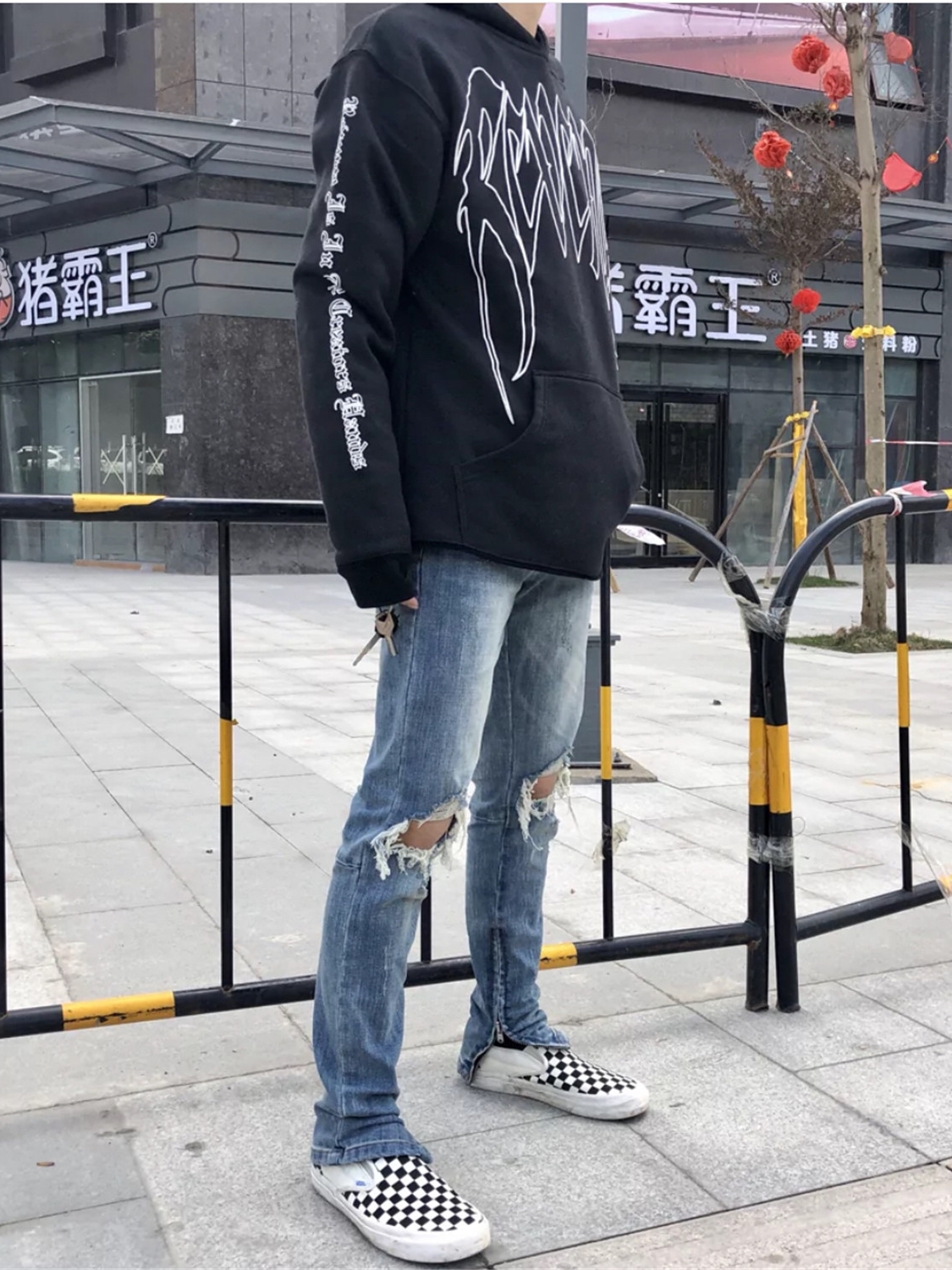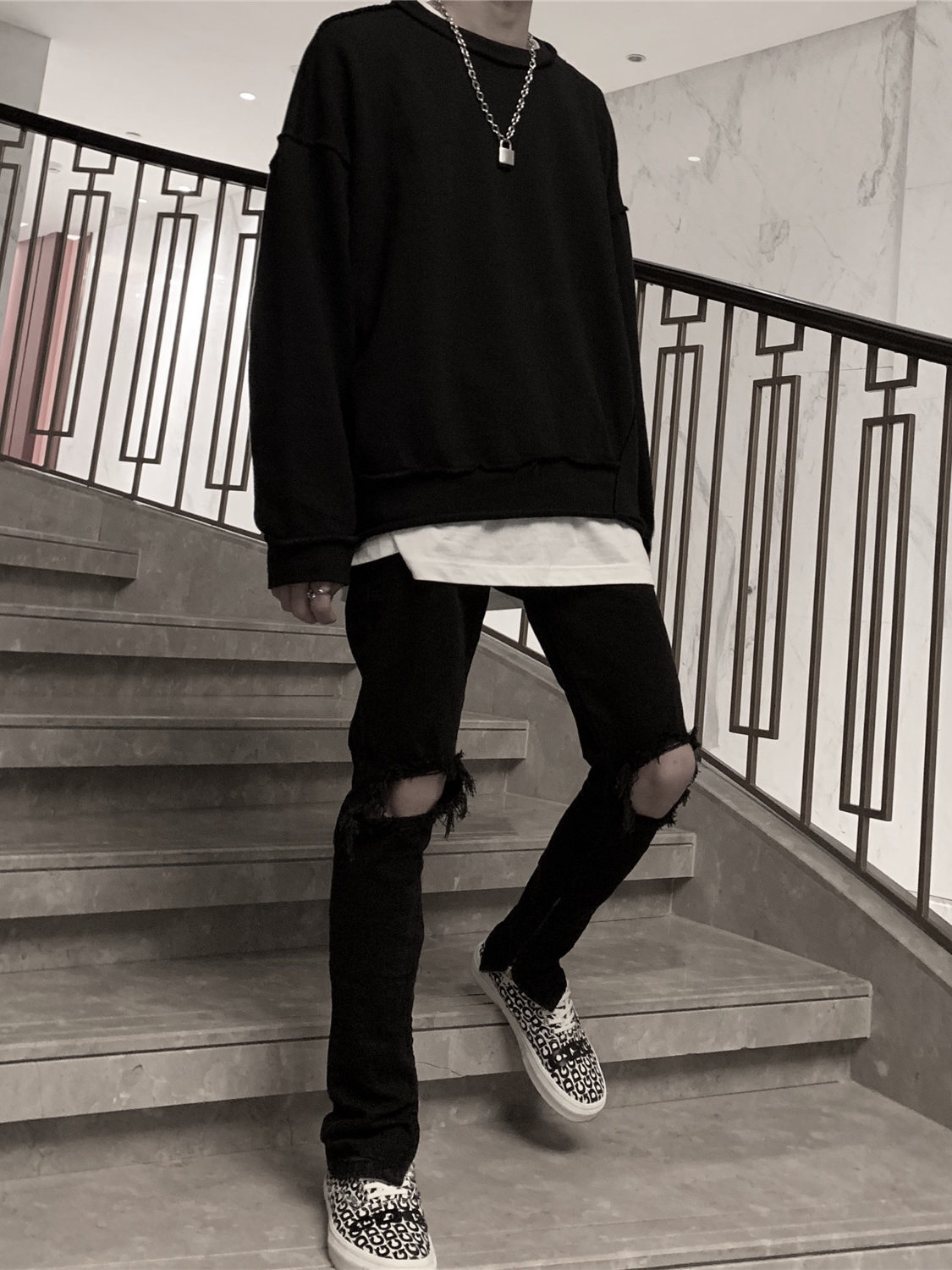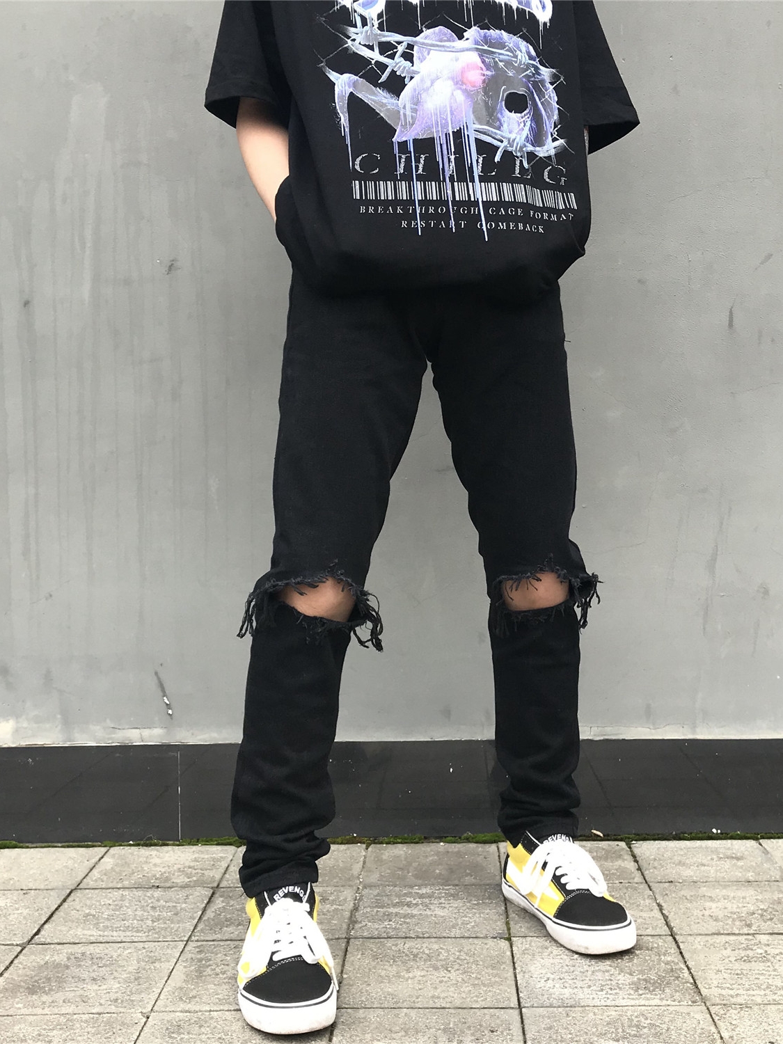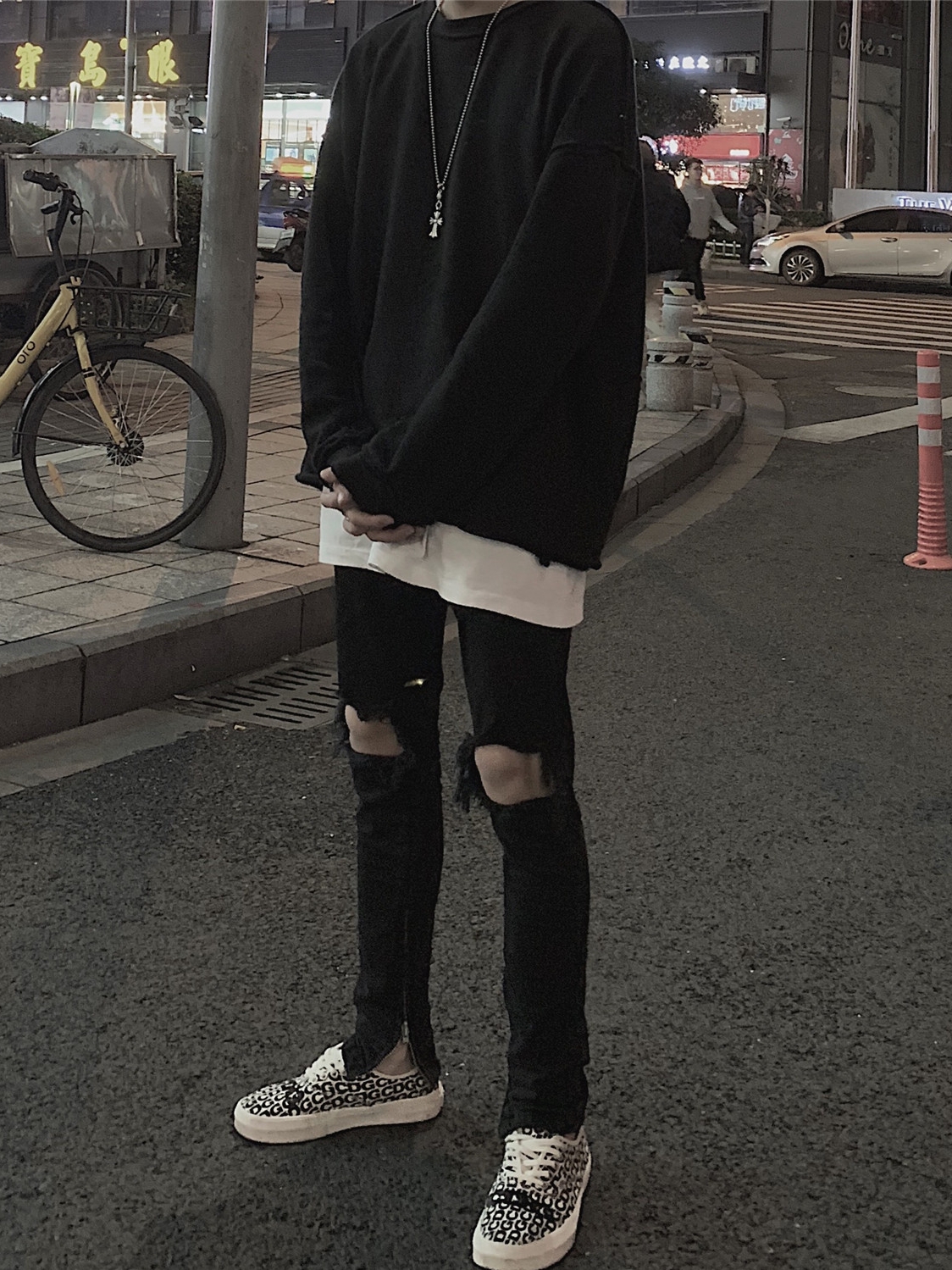 黑色修身小脚裤,加入了个性的破洞设计,极具潮范,透出率性不羁街头味儿精致流畅的走线,给牛仔裤不一样的潮流。