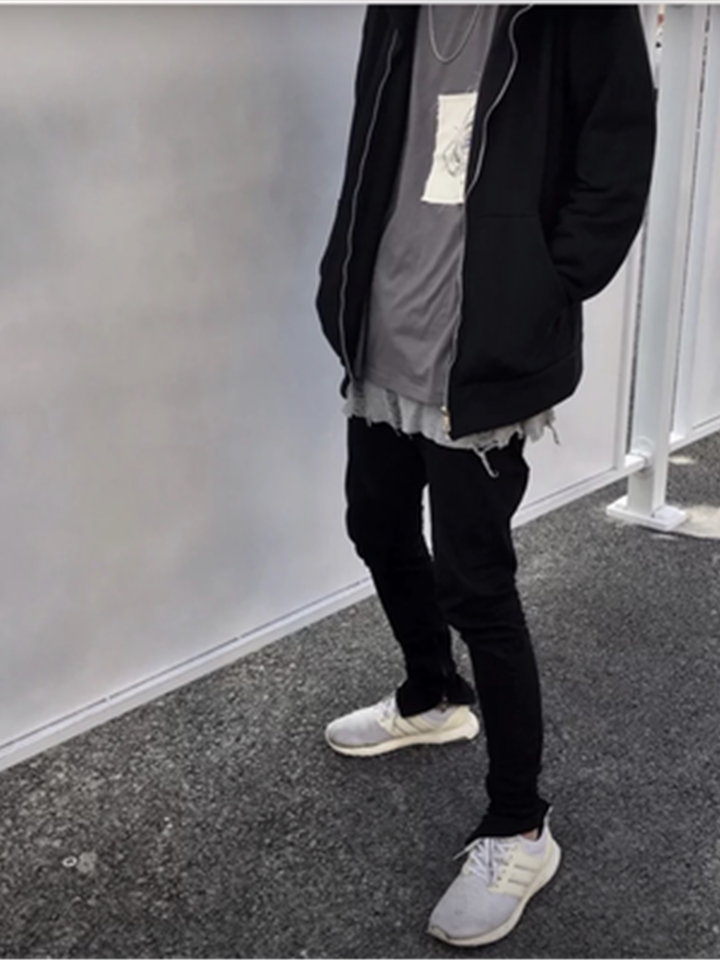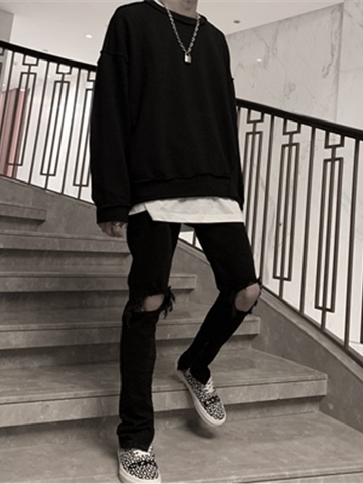 直筒的版型,无乱是你大腿肥还是小腿壮,都可以轻松装下。运用破洞设计,弱化了大腿处的宽度,造成腿瘦的错觉。搭配一件印花套头t恤,彰显街头风。