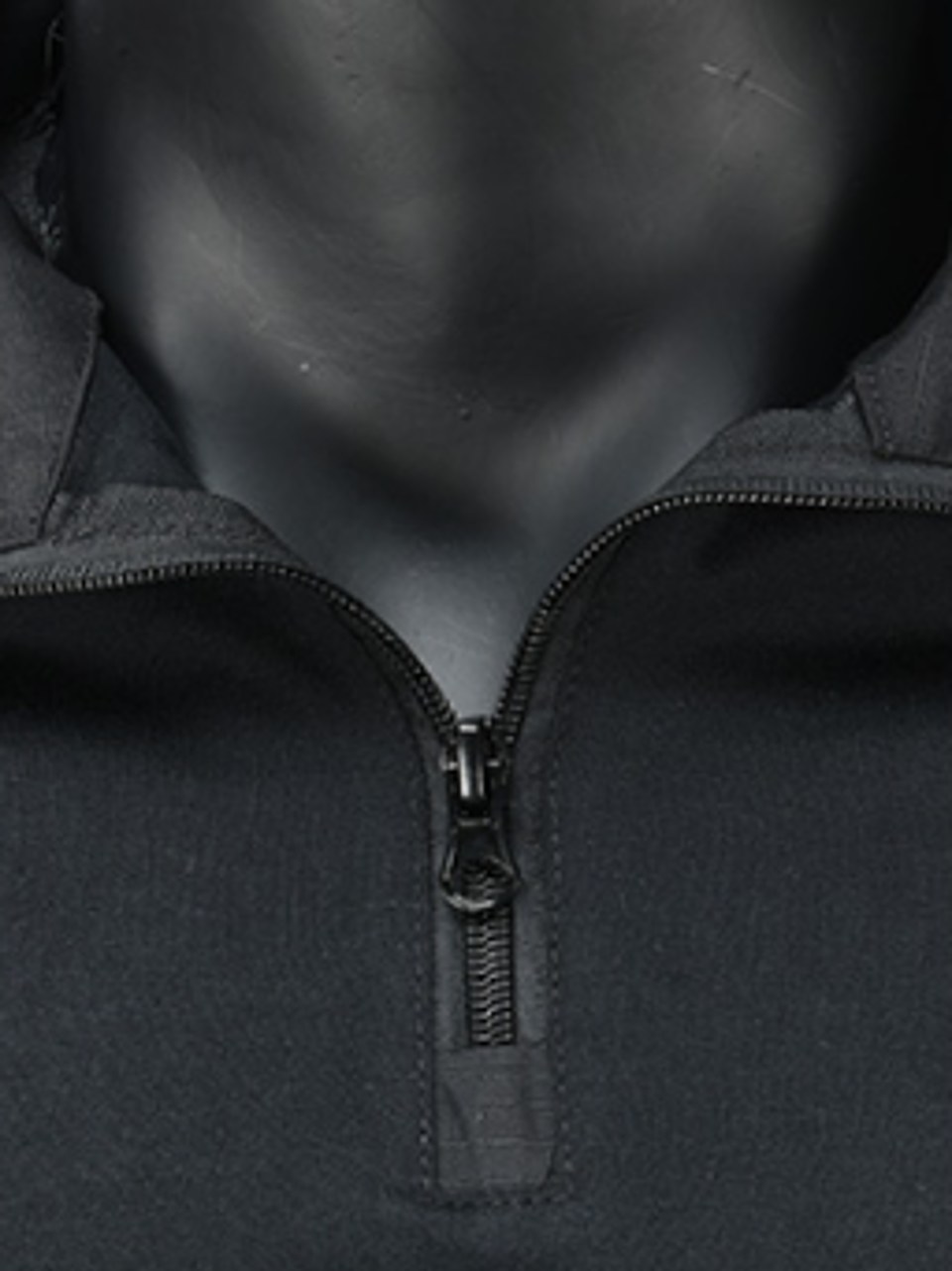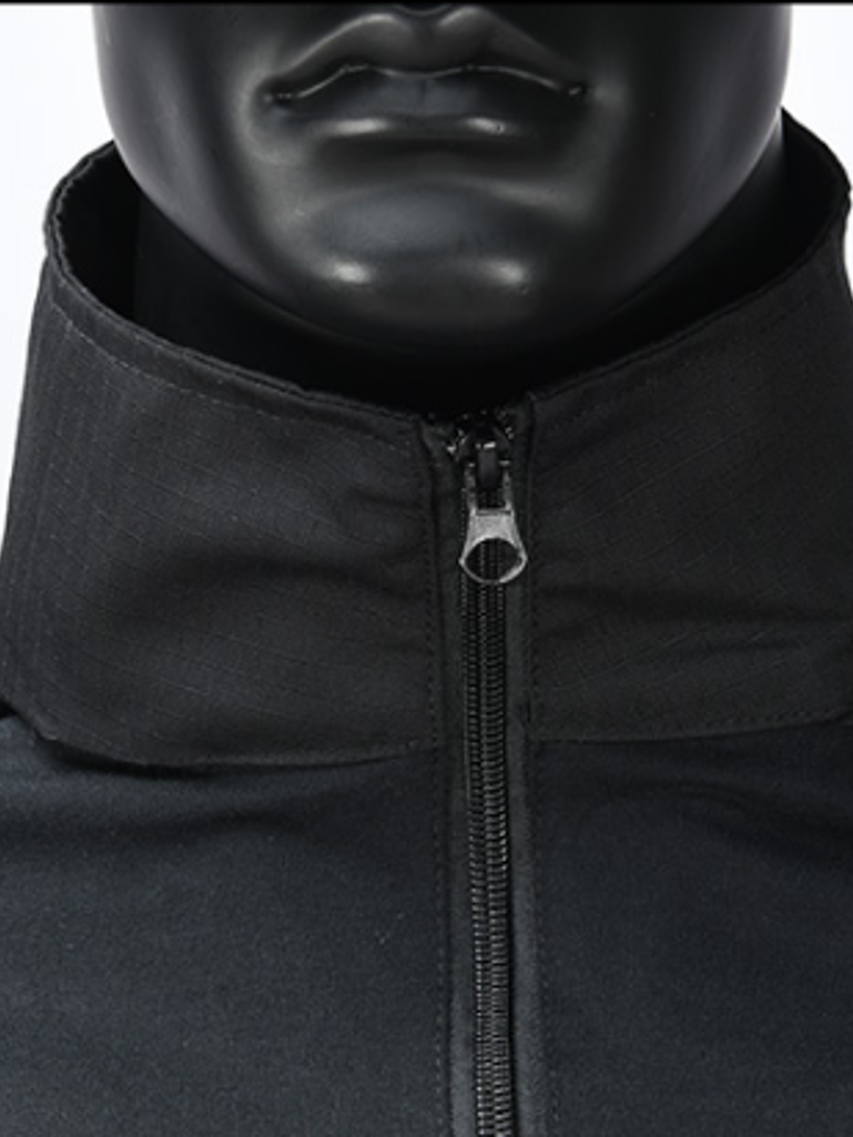 这款迷彩服套装采用的是立领领口拉链设计,能全方位包裹颈部,防风保暖。肘部膝盖可置护具,运动更加安全。