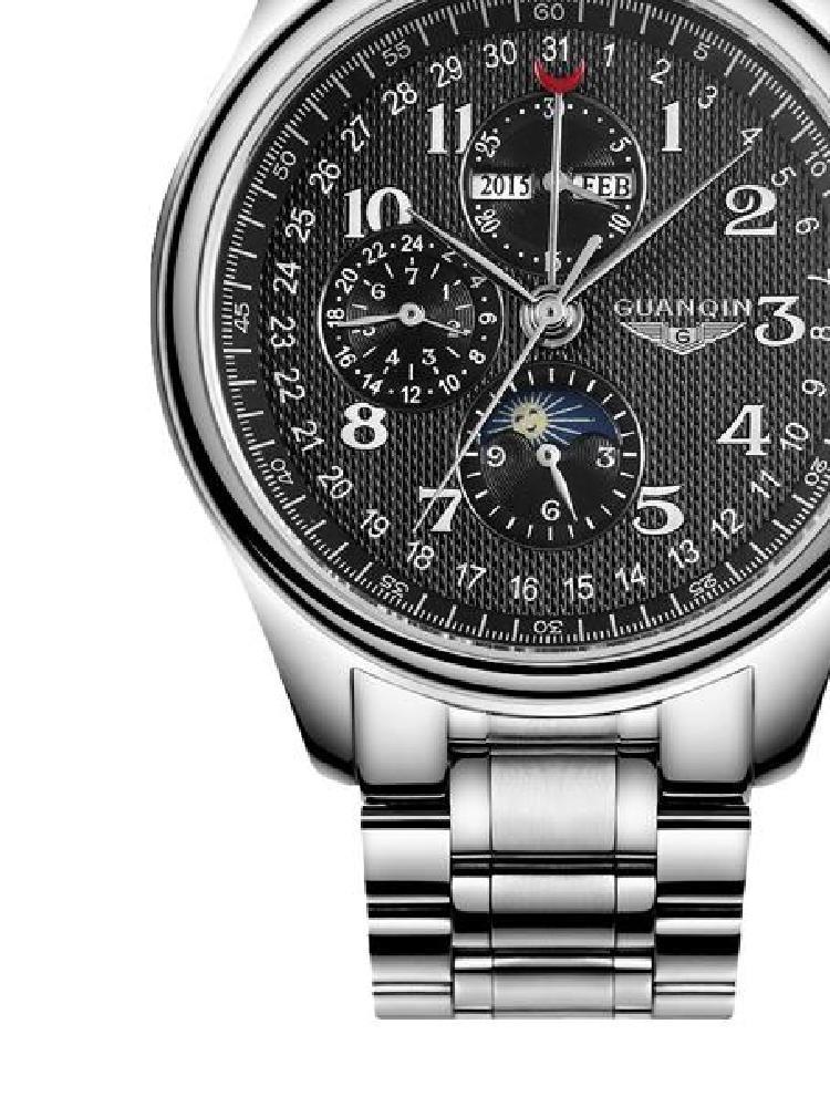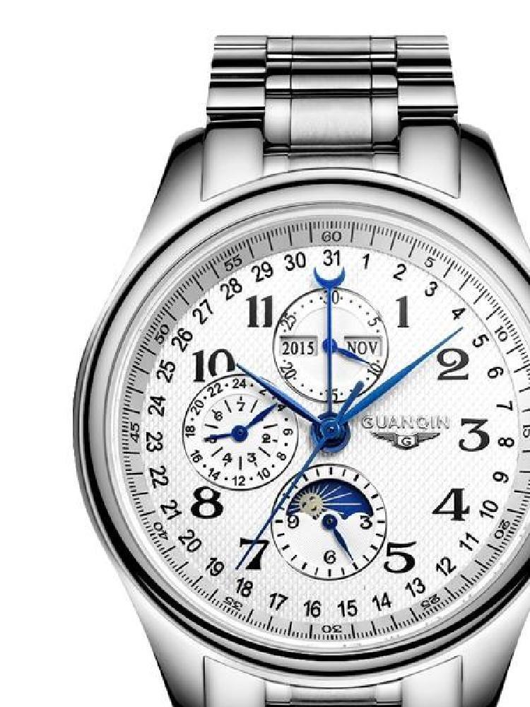 手表的表镜采用了矿物质强化玻璃,为一种预应力玻璃,在玻璃表面形成压应力,玻璃承受外力时首先抵消表层应力,从而提高了承载能力,增强玻璃自身抗风压性,寒暑性,冲击性等,通透明亮,能够清晰地观看时间。表壳为精钢材质,电镀处理,光泽锃亮,久戴不生锈。