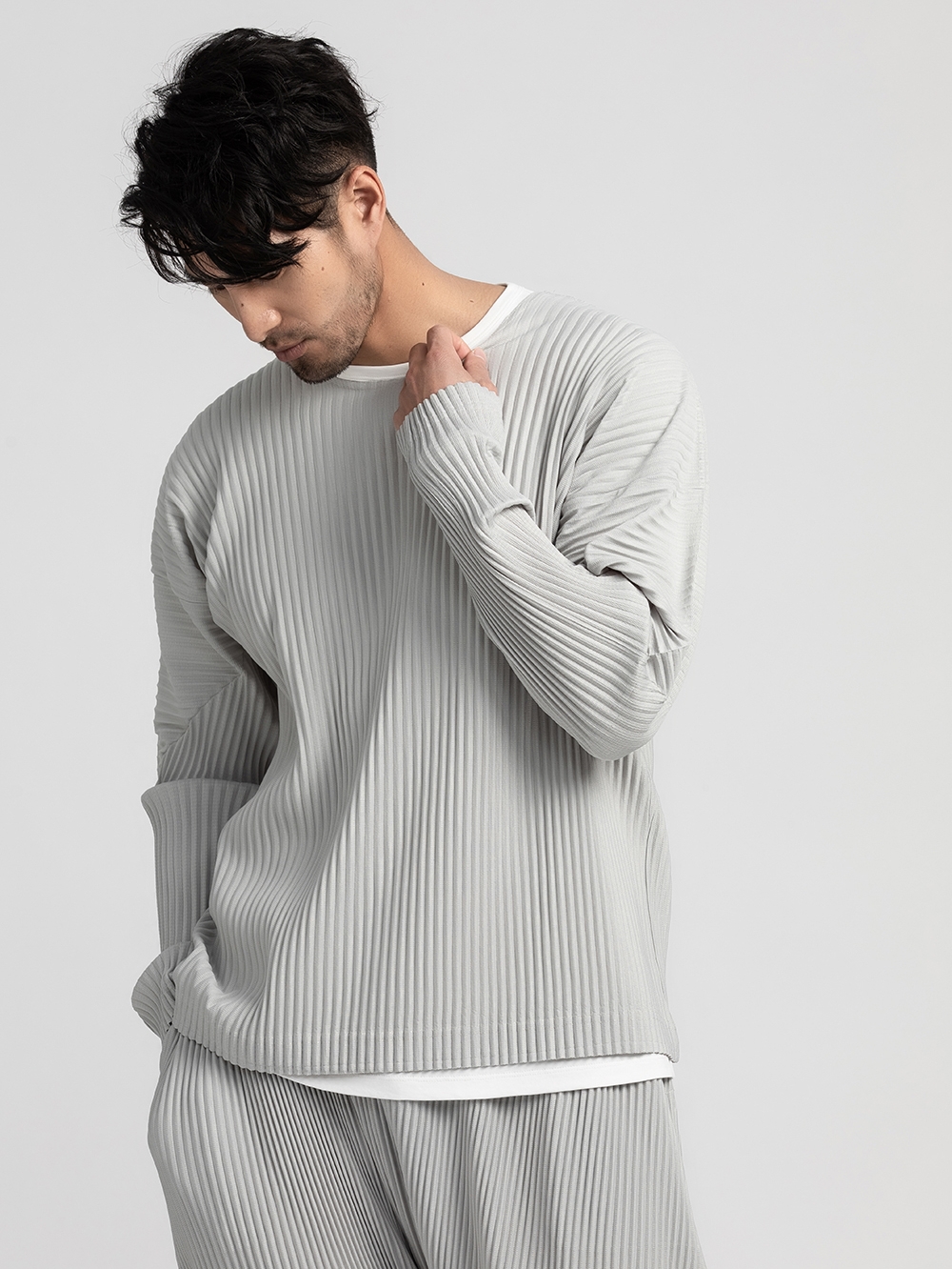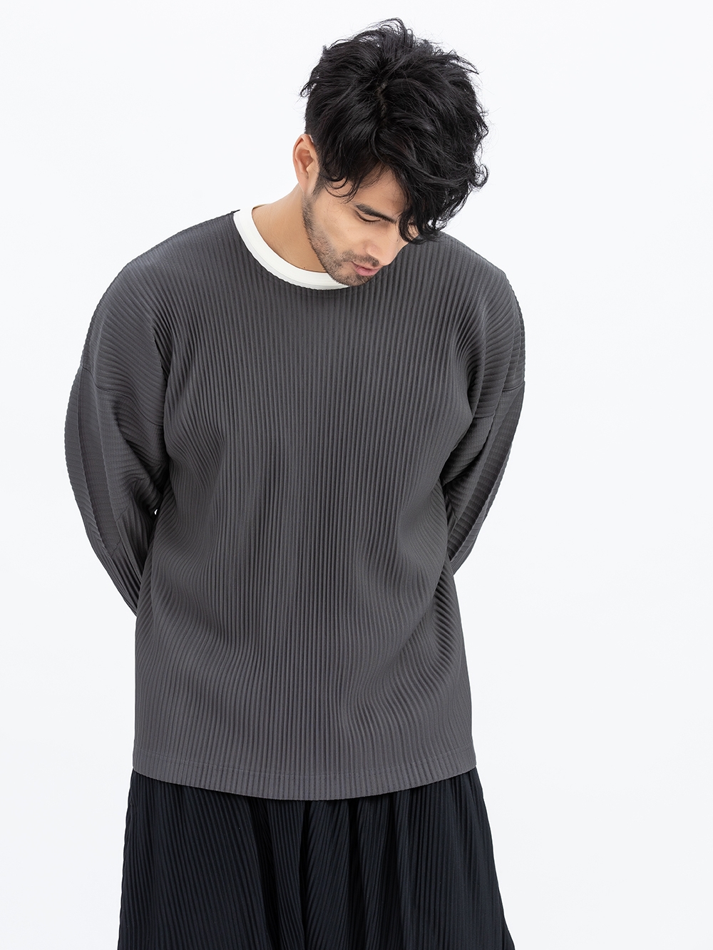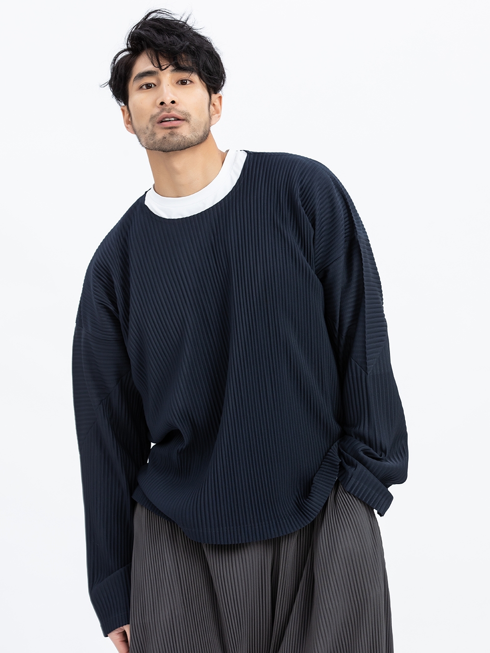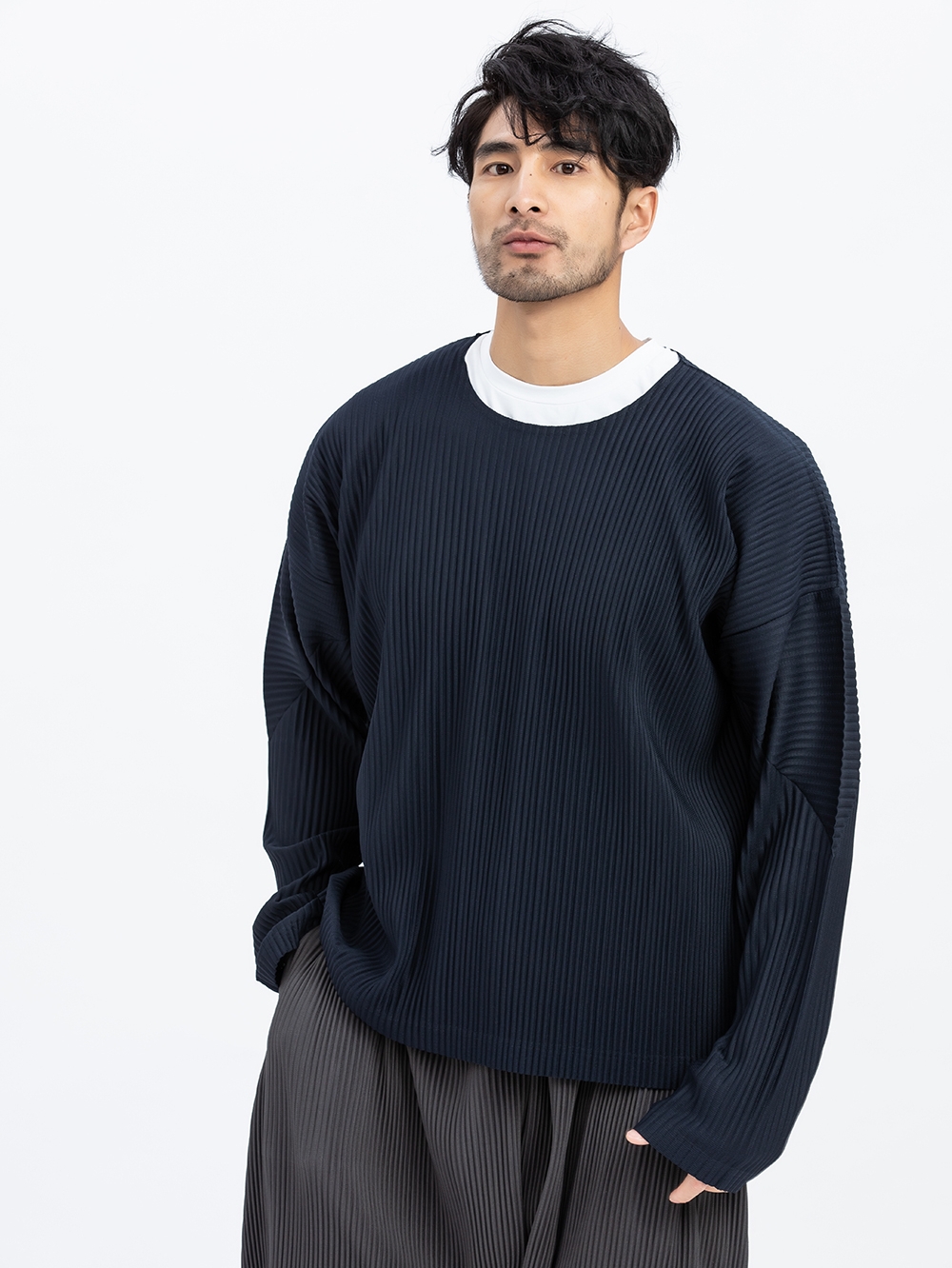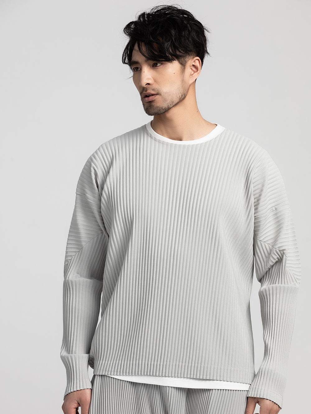 纯色的宽松T恤,很适合身材有肉肉的男士穿,面料轻薄柔软,褶皱的处理,加强了整体的层次感。