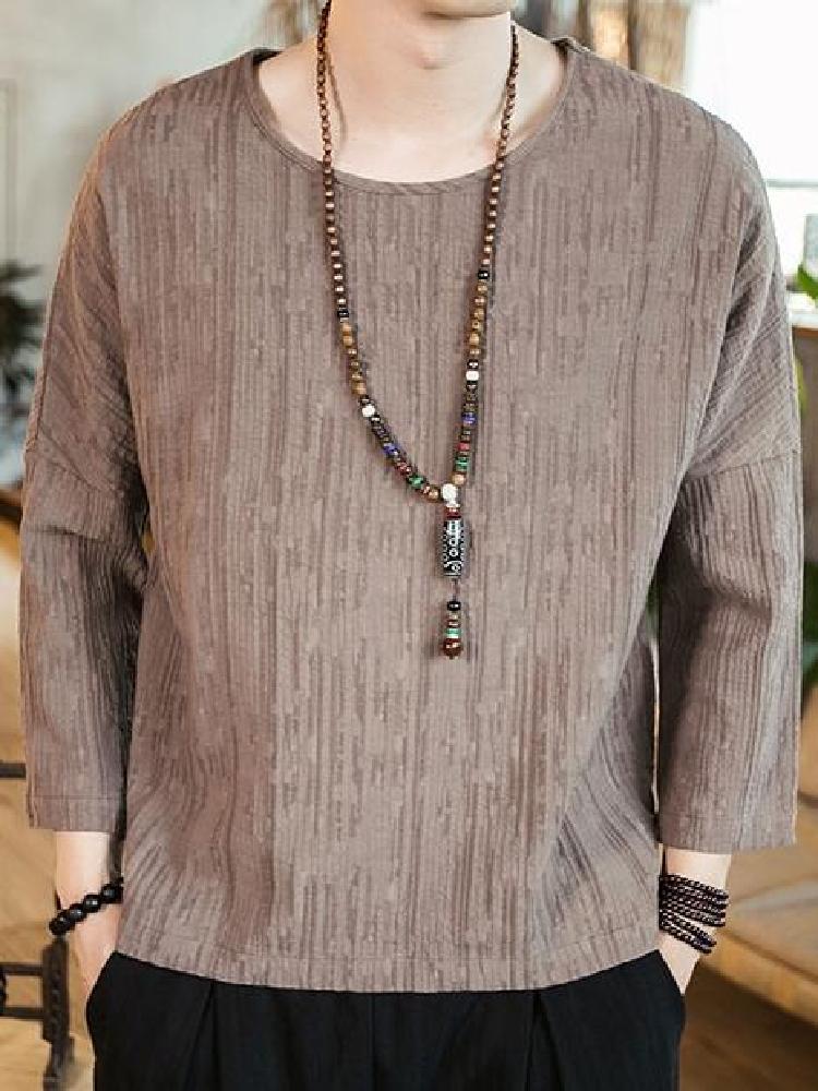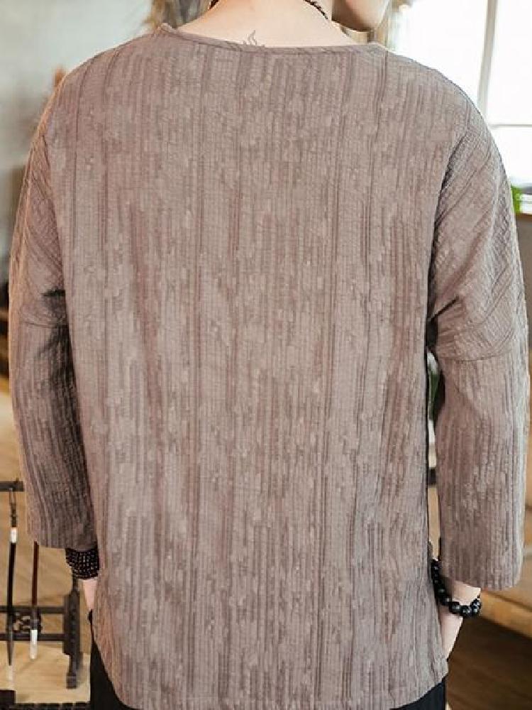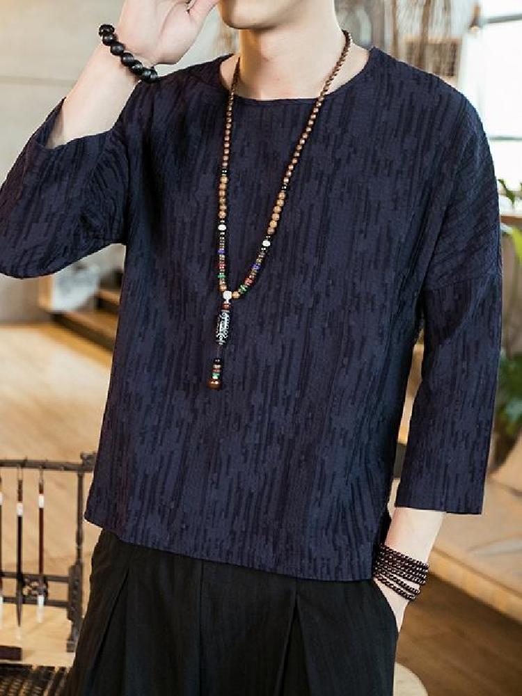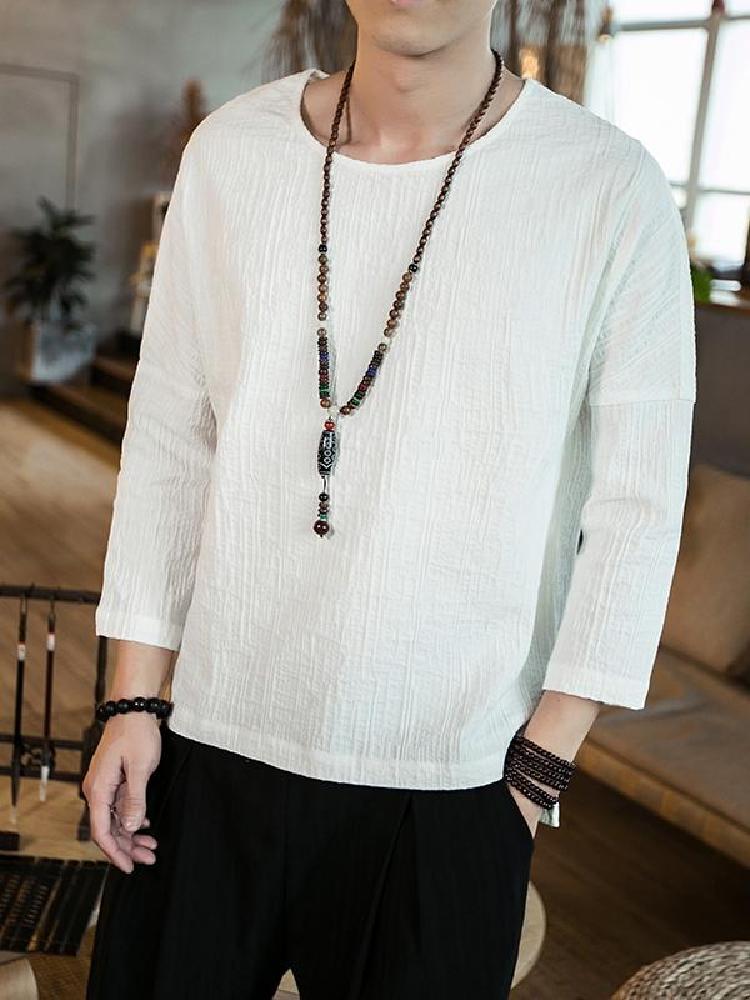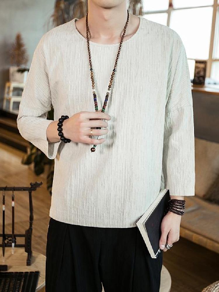 简洁的中式圆领做工使用双层黏衬工艺保证领口坚挺。七分袖口的设计,精致包边,减少束缚,穿着舒适。精工裁剪,细致走线。这是一款原创设计的改良中式国风棉麻T恤衫,棉麻混纺的面料透气舒适,非常适合夏天穿着