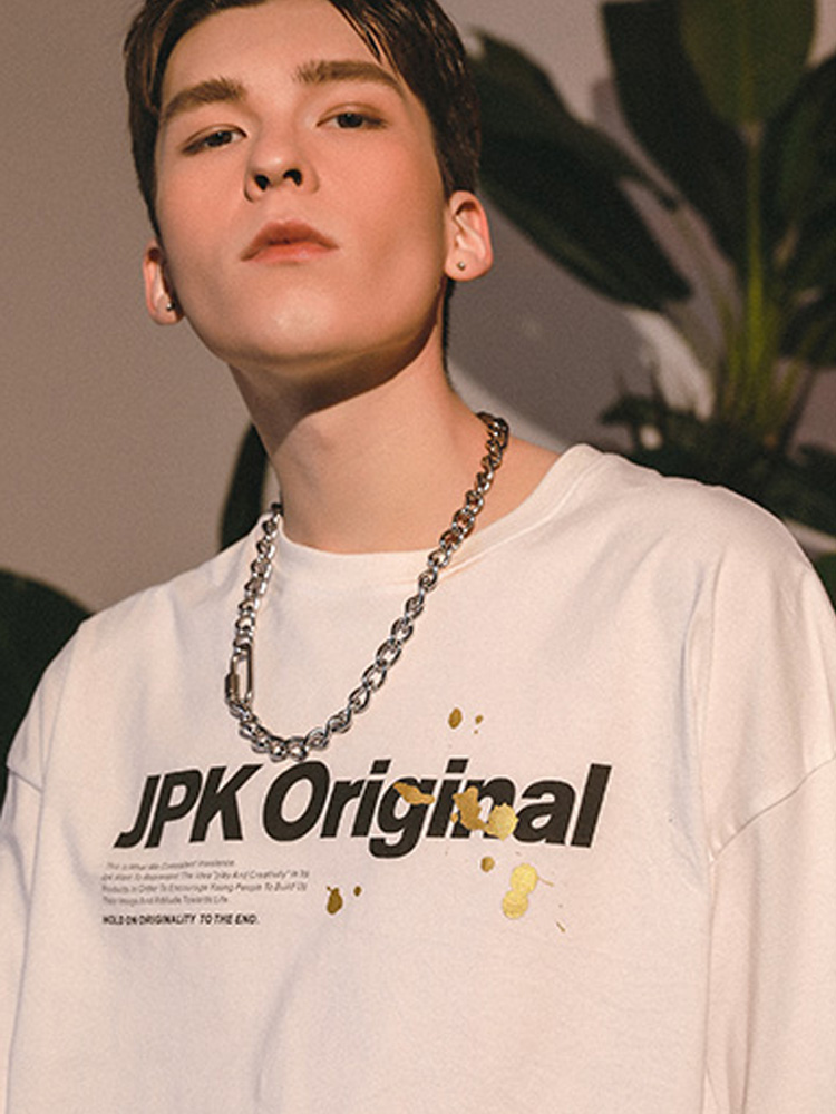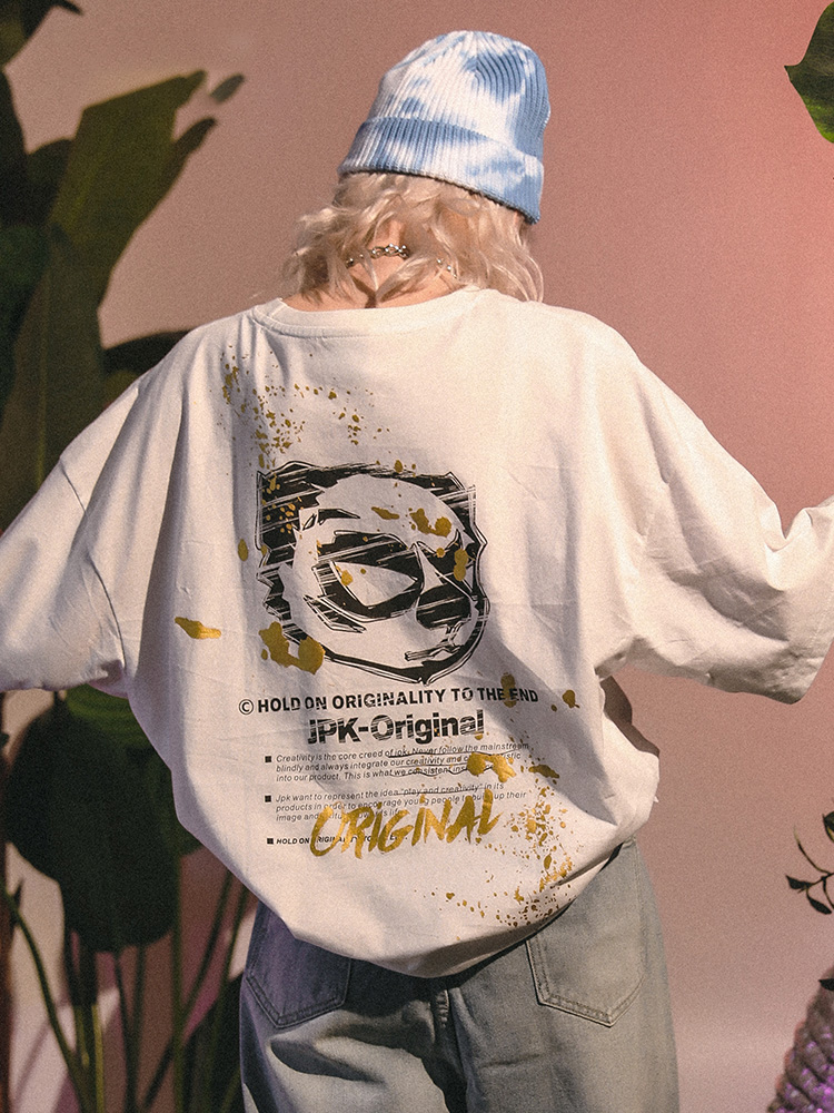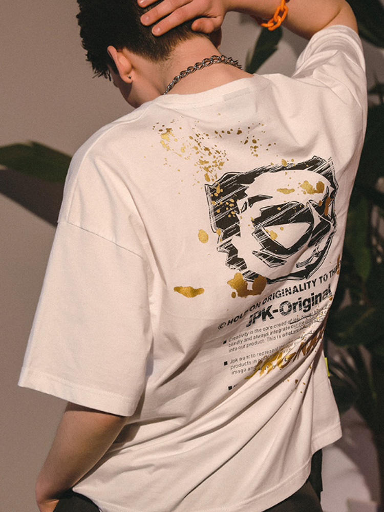 采用了宽松圆领的设计风格,轻松包容各种身型,上身舒适休闲,大方有型。而烫金印花元素修饰,丰富了衣身的视觉表现,时尚美观效果佳。