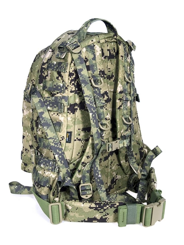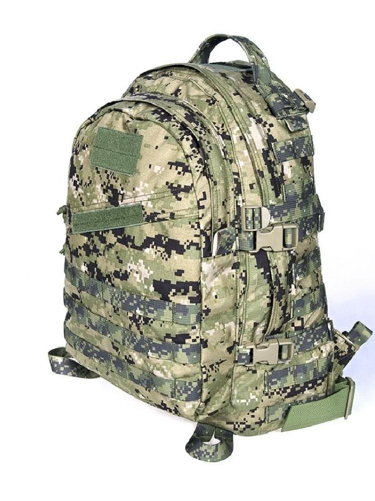 展现军旅风情的一款户外背包,采用尼龙迷彩面料,经过防泼水处理,可随意应对各种复杂天气。多包体的打造,合理的设计分配,带来物品的分类别放置。高品质拉链,舒畅可靠,保证陈物安全。