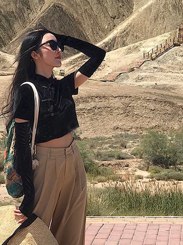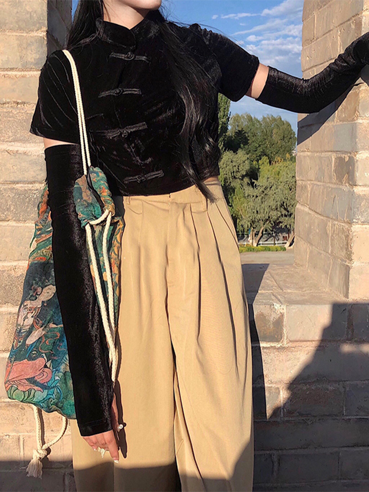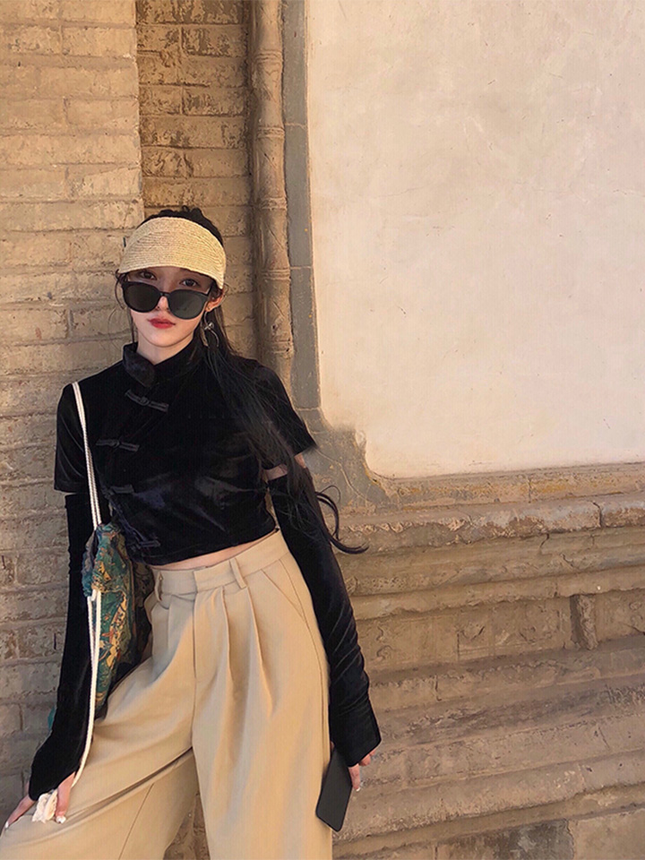 文艺复古盘扣丝绒短款改良旗袍搭配卡其色宽松高腰长裤,更显好身材,整体风格时尚大气,同时又略带中国风优雅复古的的气质。