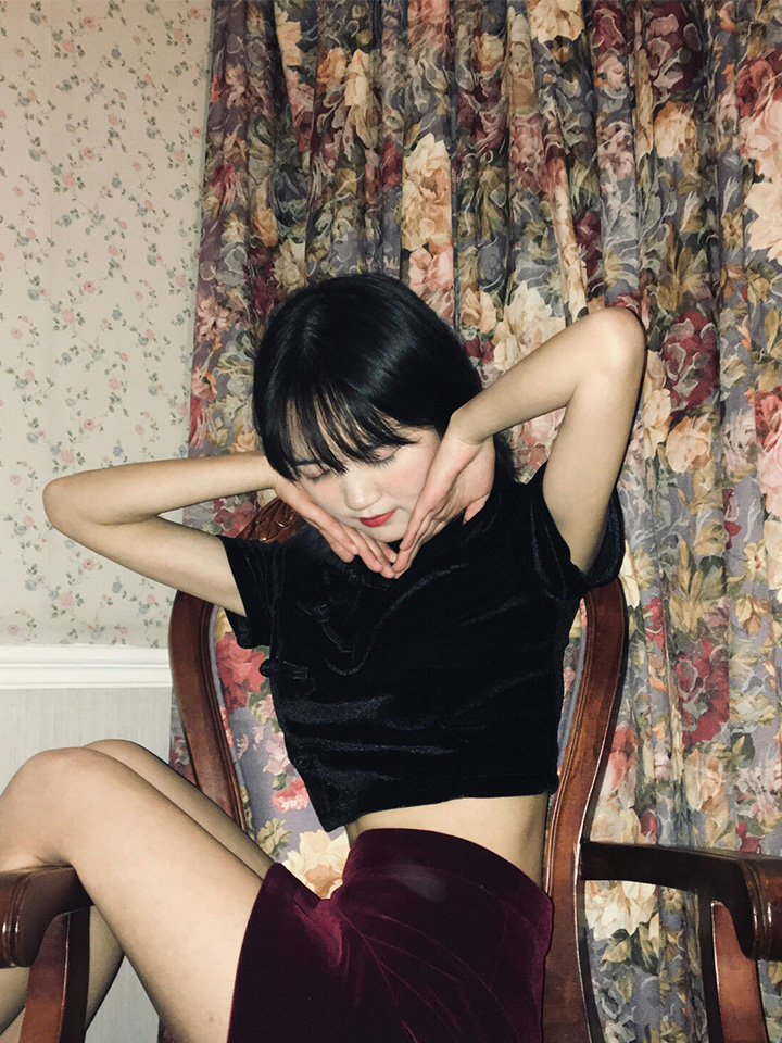 文艺复古风格,精美的黑丝绒面料,阳光略微散发微光更显高贵优雅气质,复古盘口设计和短款漏腰设计,不仅彰显中国风同时又不失小性感。