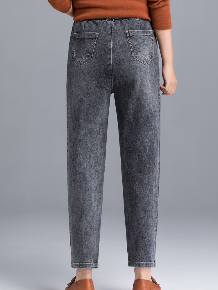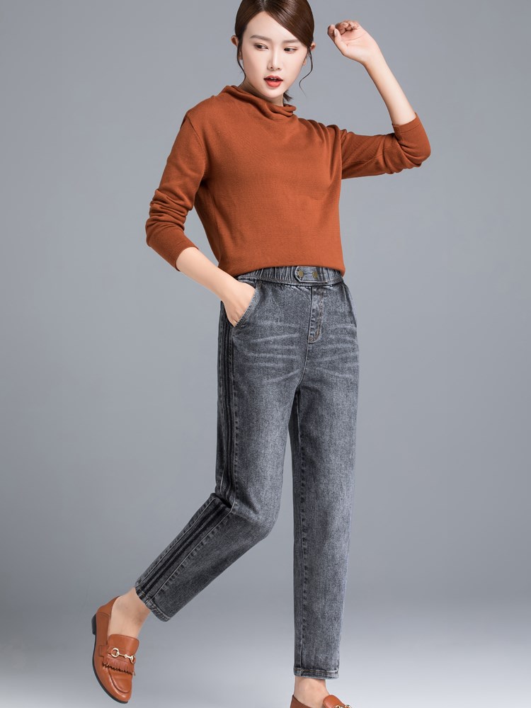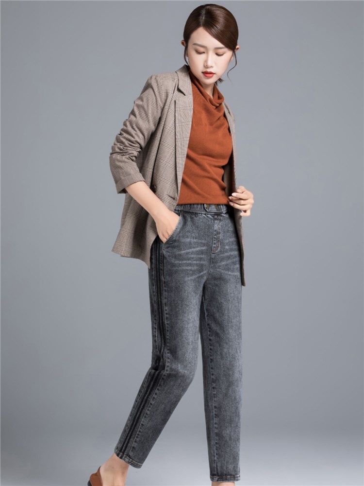 高腰设计,拉长身材比例。高腰牛仔裤,显瘦显腿长。直筒裤型,修饰腿部线条。