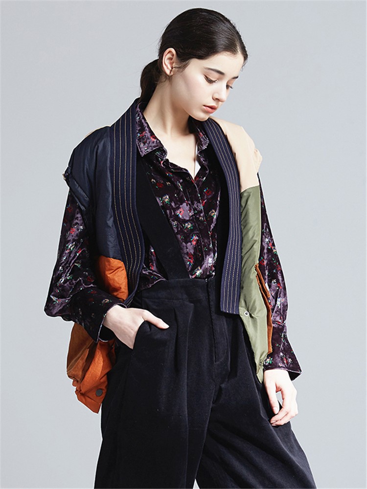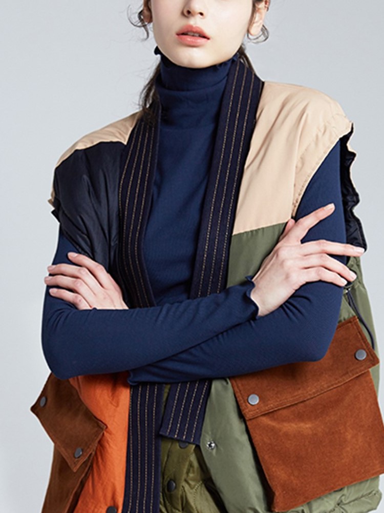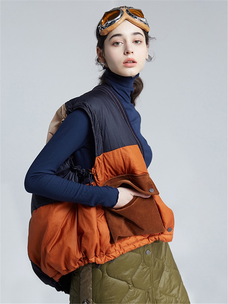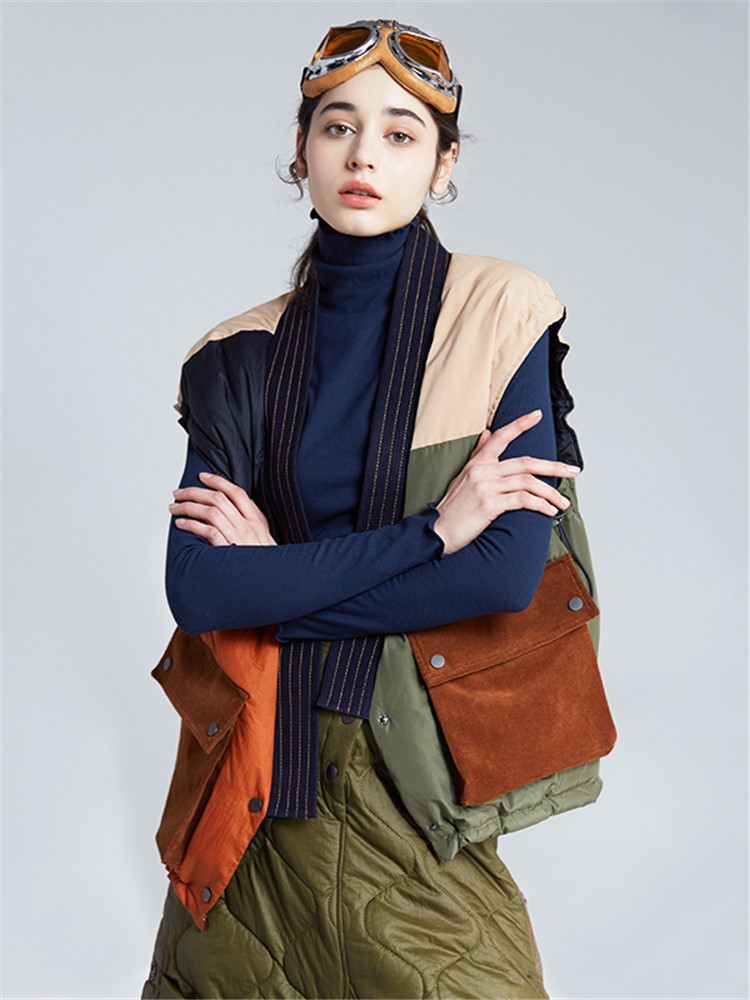 连帽设计,防风保暖性强,装简约时尚,时装又百搭,优质羽绒,穿着舒适保暖,色拼色设计,时尚感十足,马甲款式,穿着舒适自在,拼色设计,丰富视觉层次,修身版型,凸显曼妙身姿,短款外套,拉长身材比例。