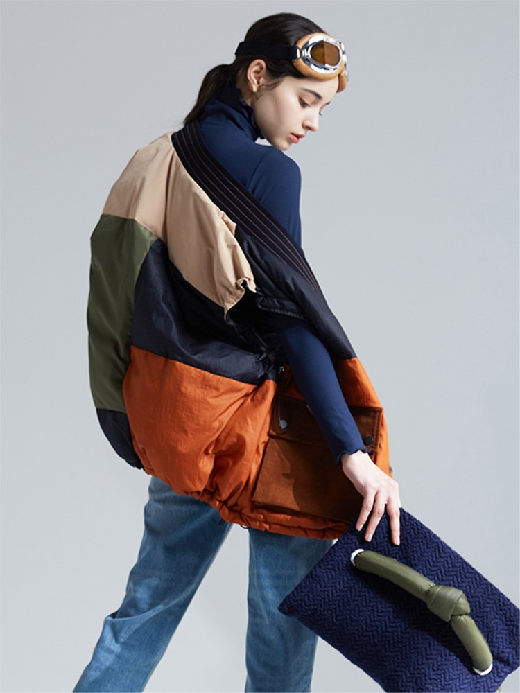 撞色拼接的设计,打破了纯色的单调,更显时髦感。