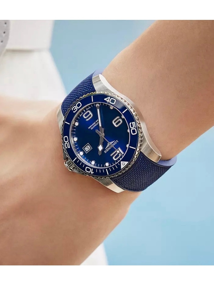 蓝色太阳饰纹的表盘,结合上蓝色橡胶表带,呈现出一种沉静又靓丽的时髦风情。