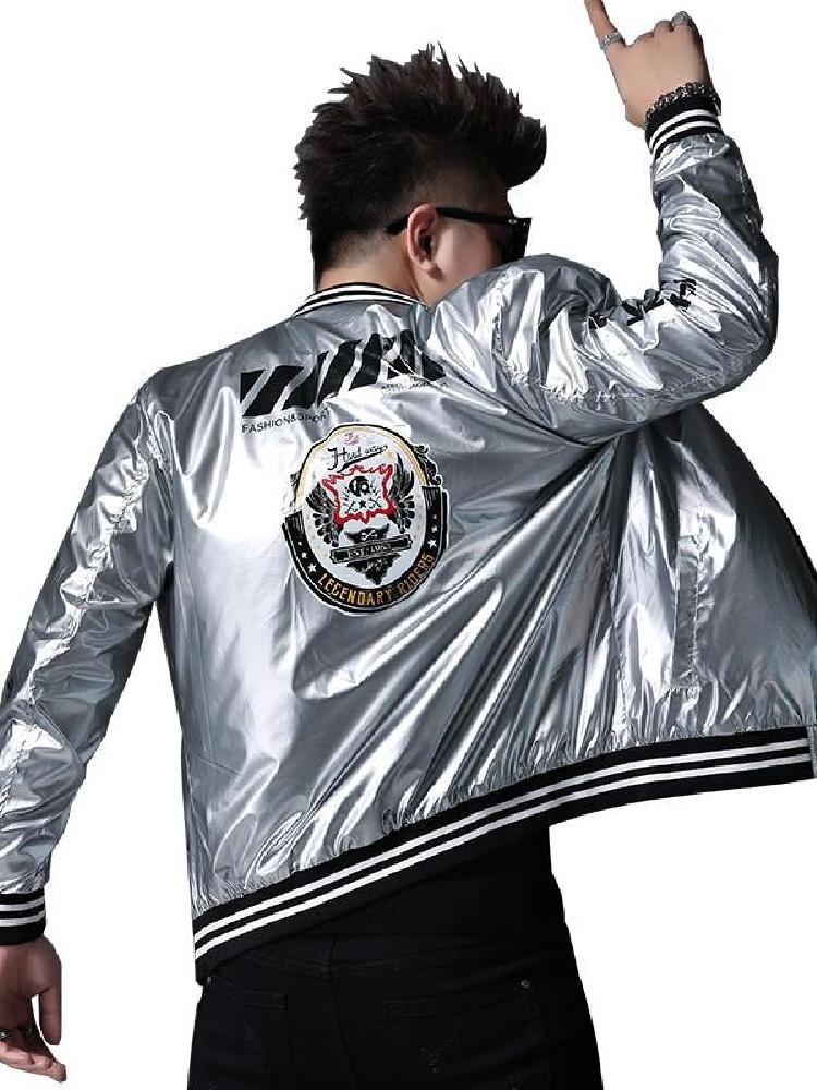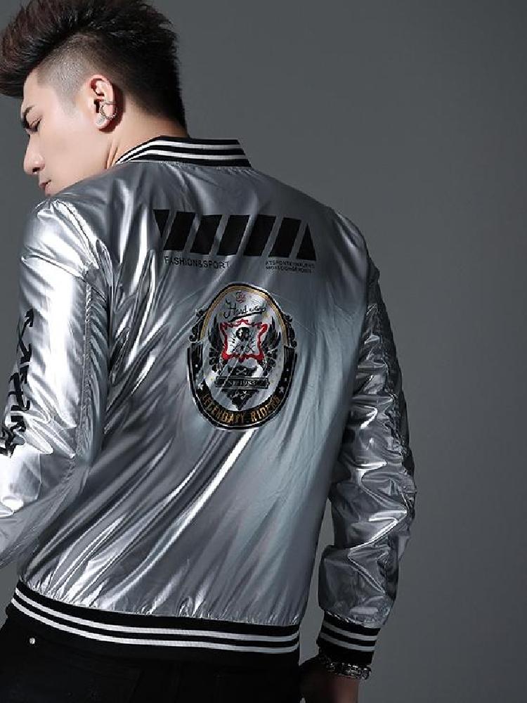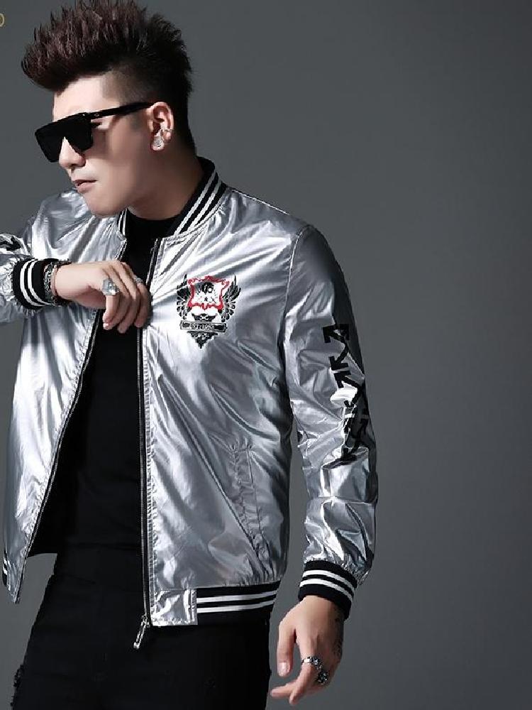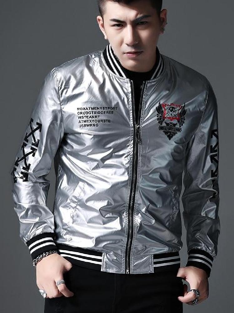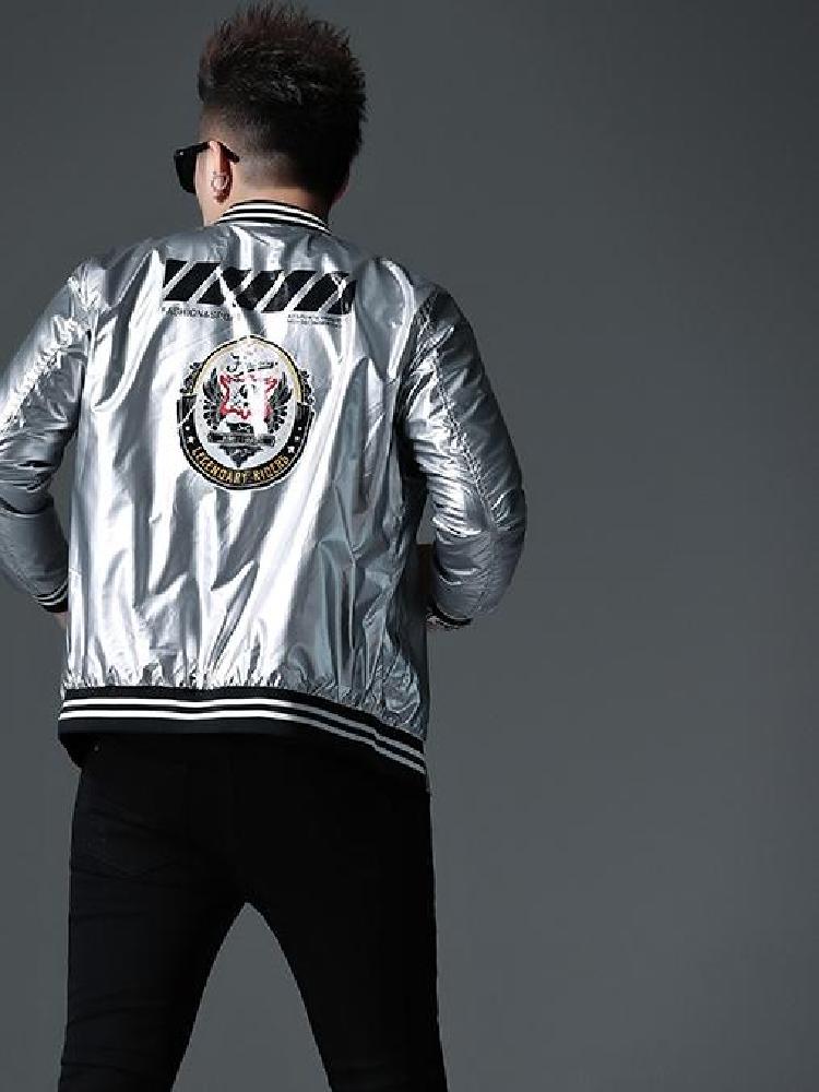 这款夹克外套选用了银色的色调,金属色的配色上升的衣身整体的时尚感和潮流气息,更具酷帅和街头感;采用了棒球服的版型,显得运动有型,立领的设计,搭配休闲T恤,简约又休闲。