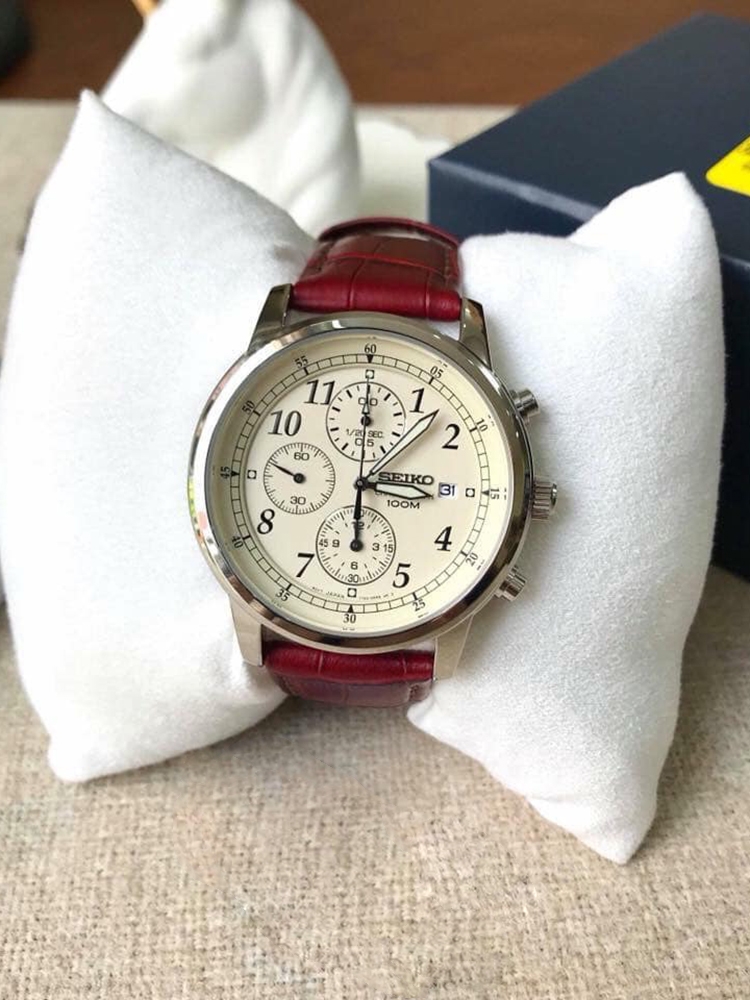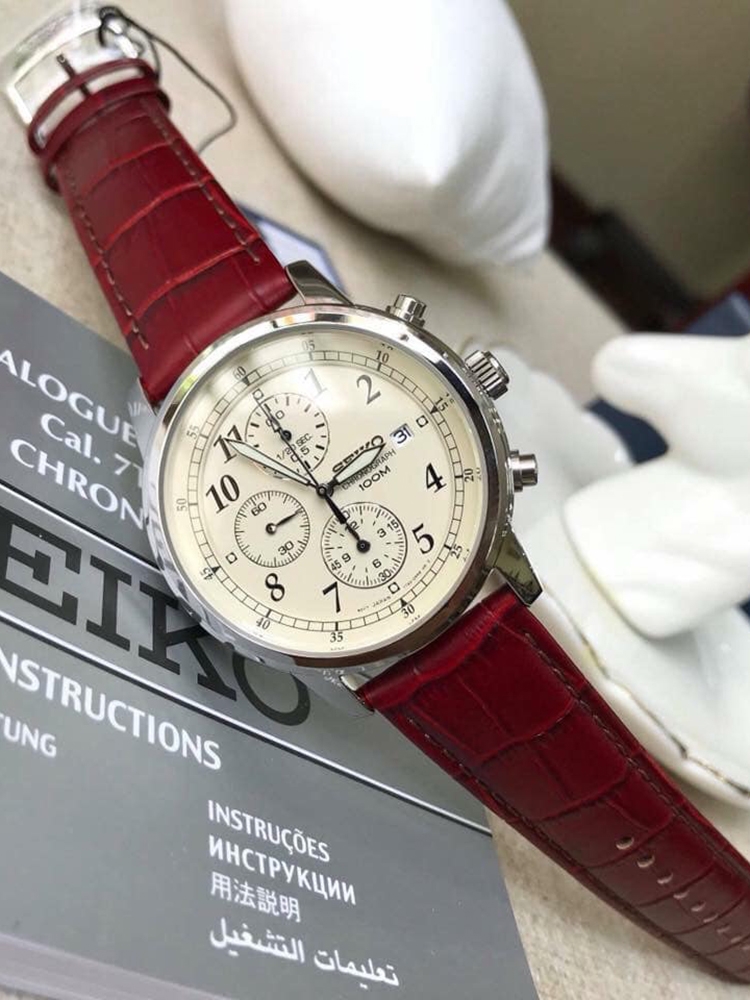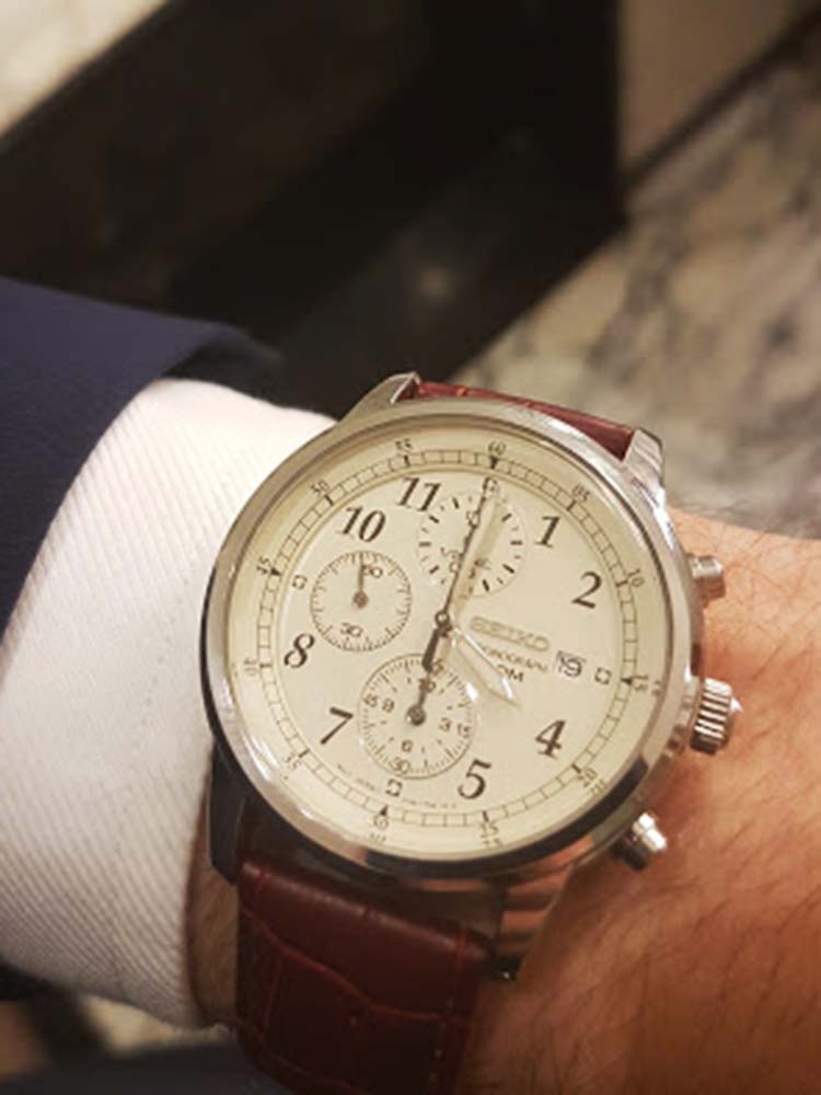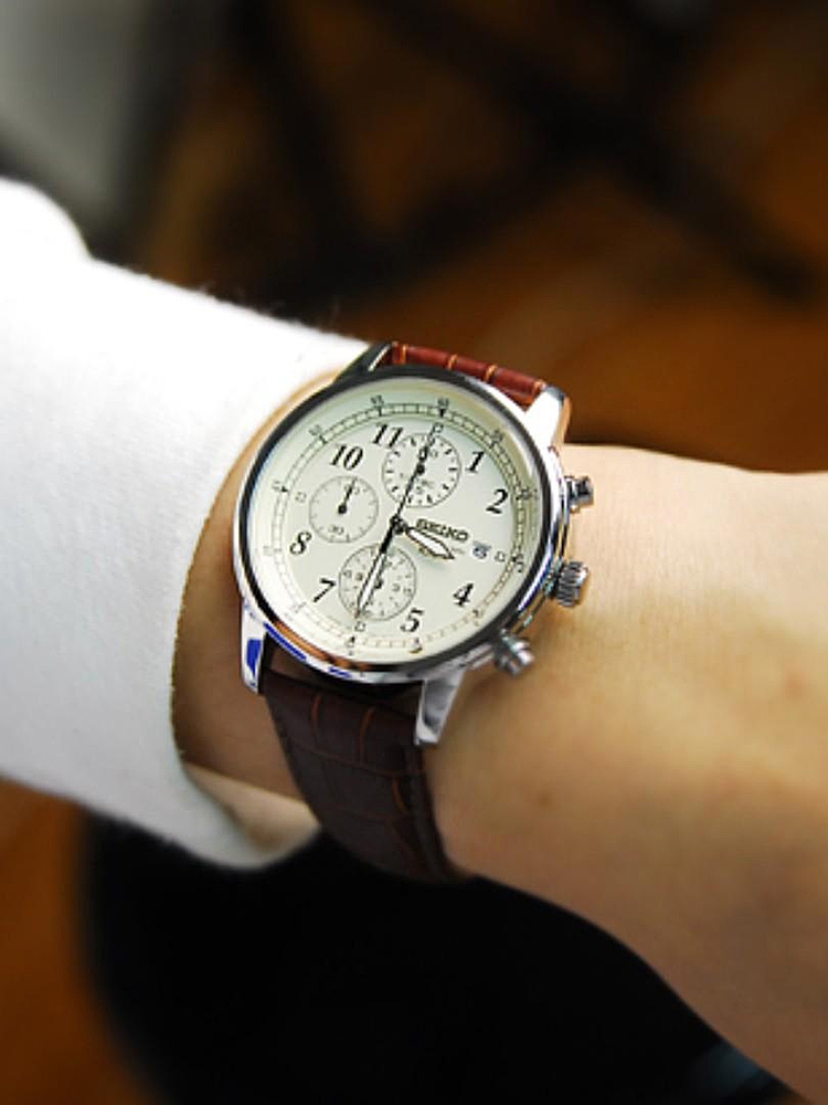 SEIKO 精工 Chronograph系列男表,型号为 SNDC31。整体简洁大方,公务出行佩戴尤为合适。米色表盘棕色皮带,搭配经典三眼装饰,外加表盘上方的日期显示,美观功能两不误,整体文艺气质浓厚。