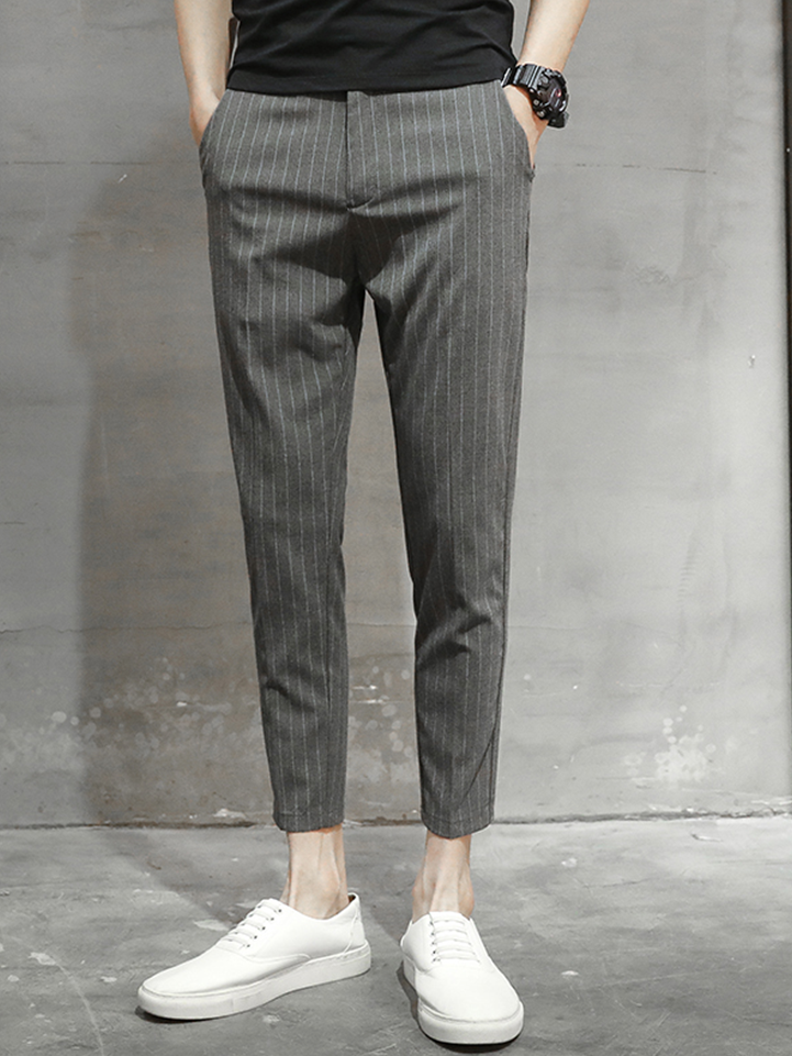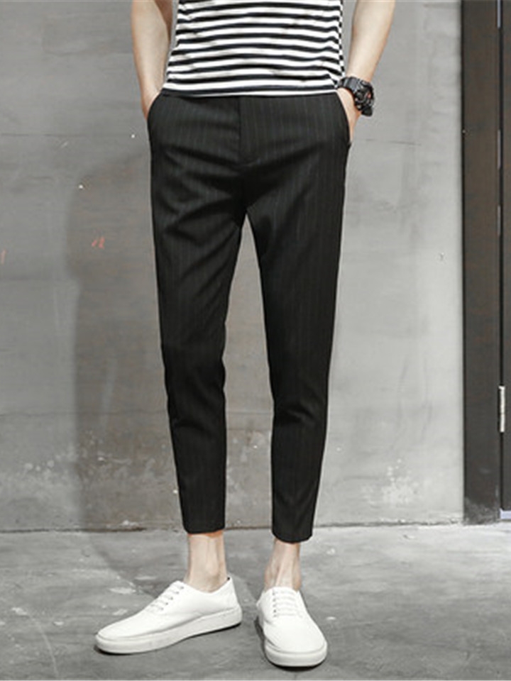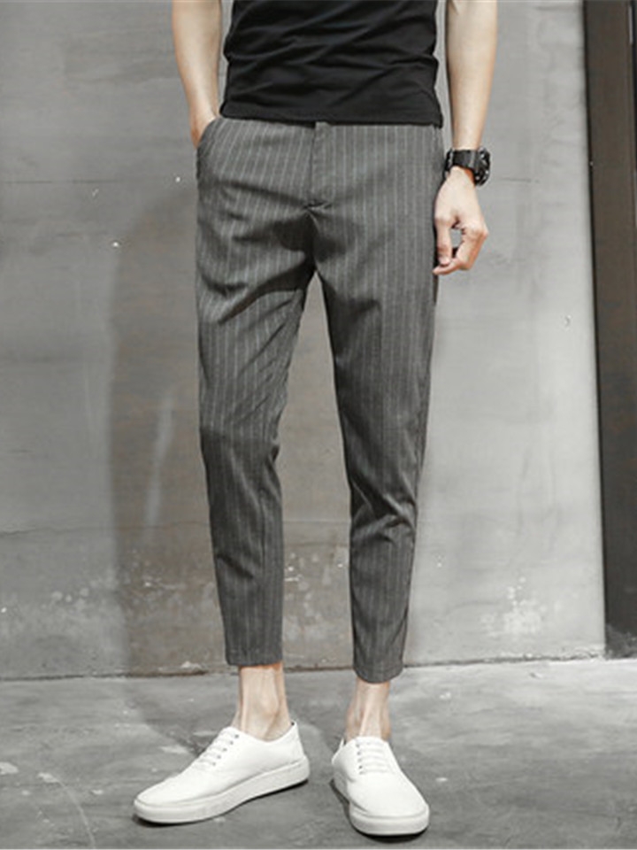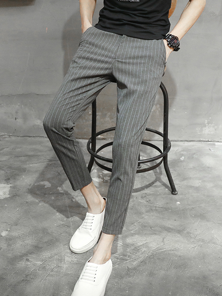 修身九分裤型的休闲裤,结合竖条纹设计的纹样,格外显瘦百搭。搭配纯色的t恤衫设计,修饰衬托简洁干练的都市型男气息。