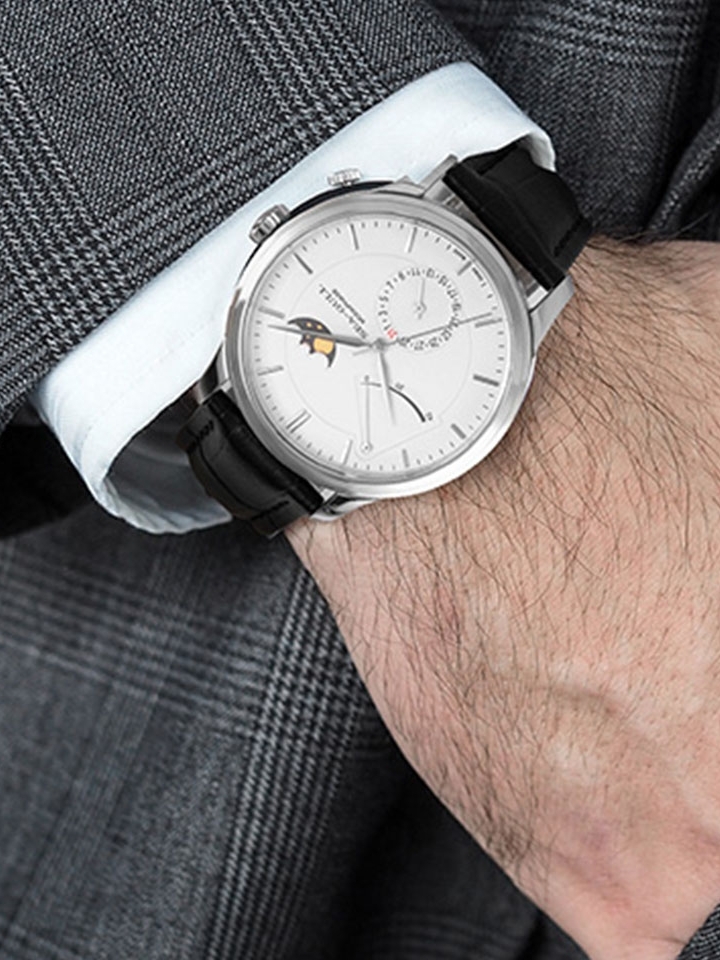 男款全自动多功能机械表,30米生活防水,具有星期、月份显示、日历、月相显示的功能,外表优雅,内心强悍。