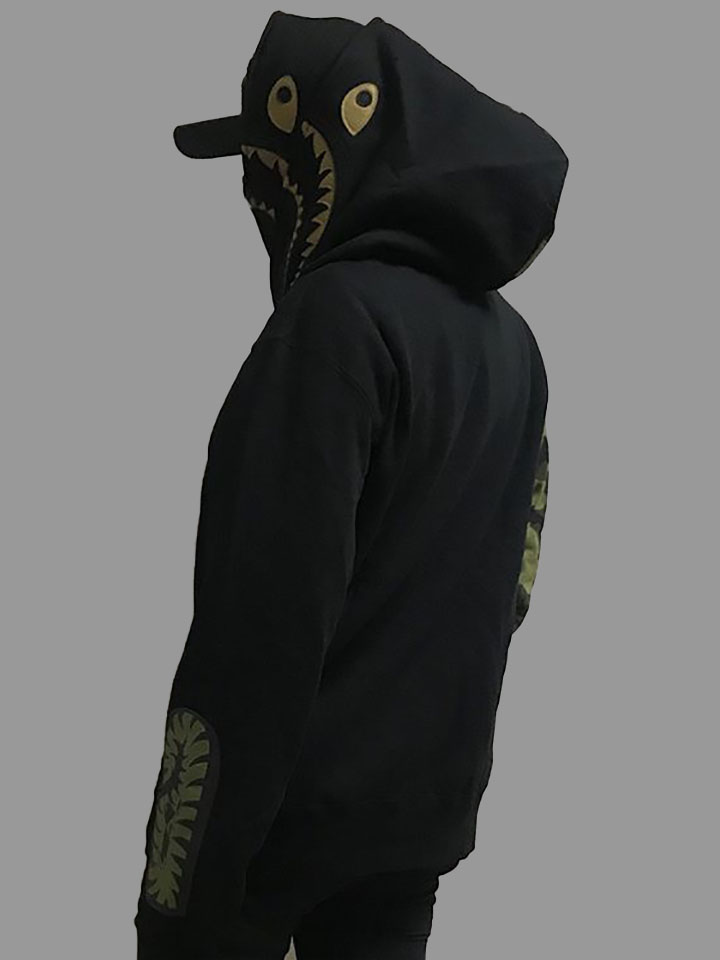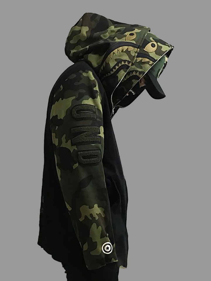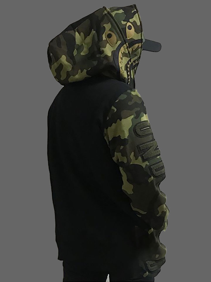 这款休闲帽衫外套采用了经久不衰的迷彩颜色,搭配拉链帽搞怪的图案,给人眼前一亮又搞笑的感觉。