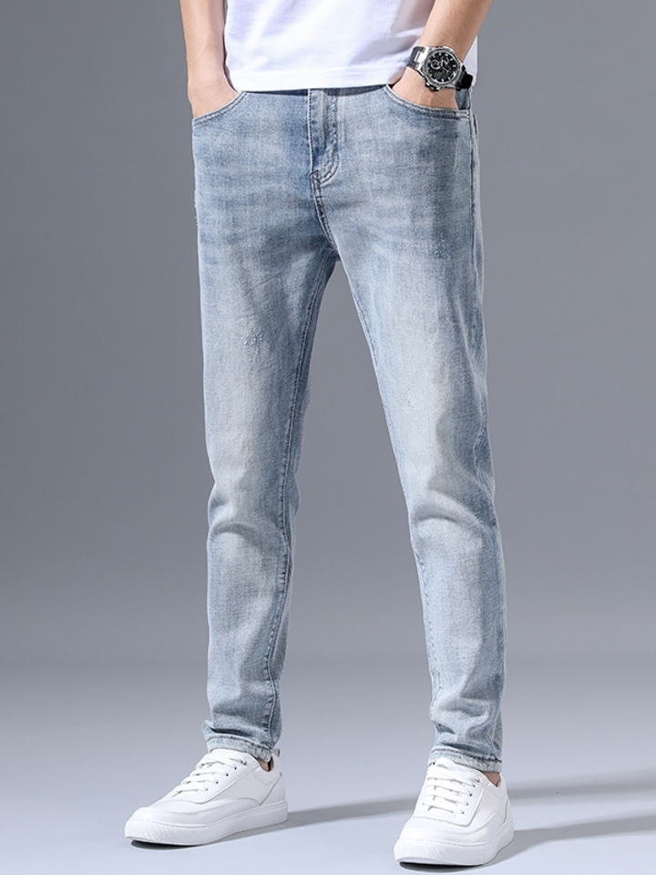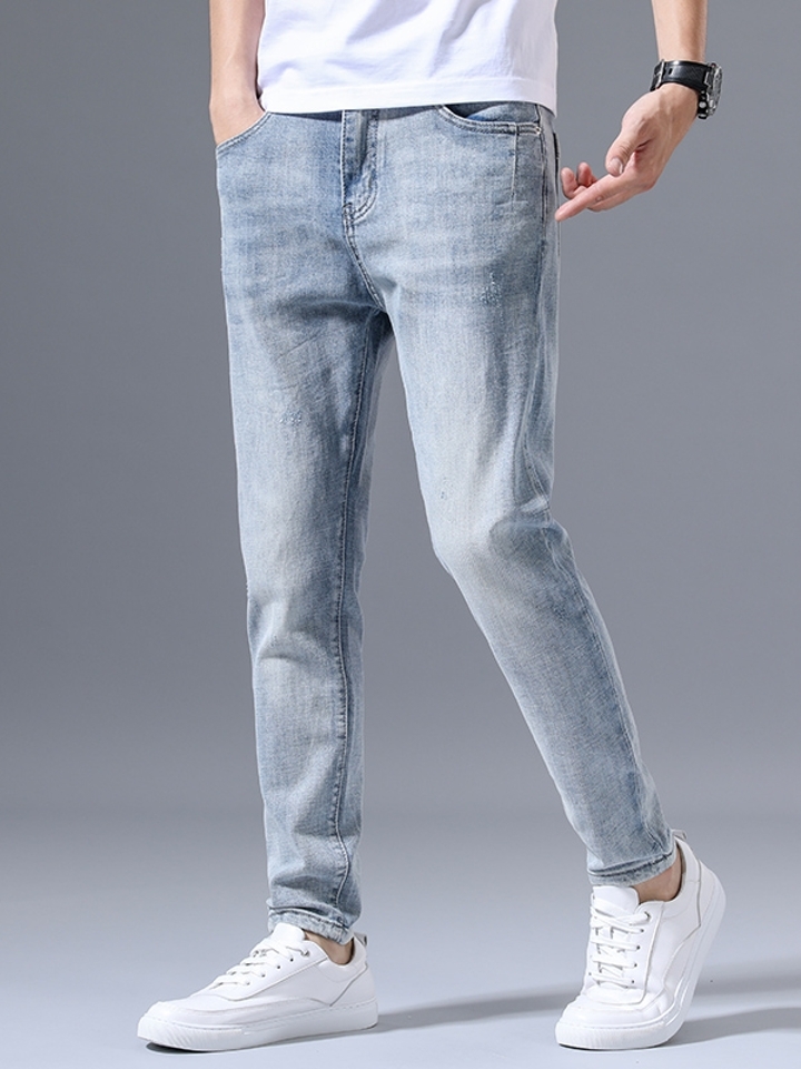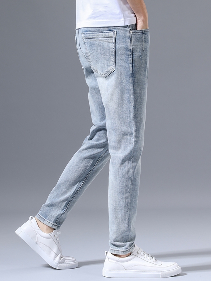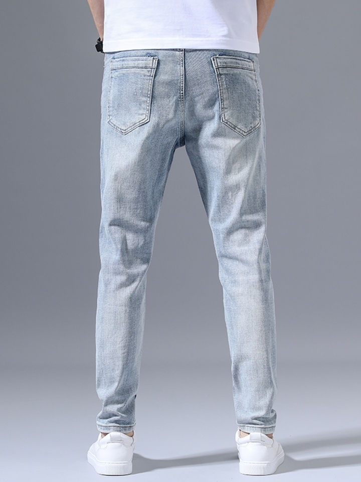 同时上宽下窄的版型增加了穿着的舒适和修身型,水洗工艺更强了复古的调调,微微卷边的裤脚,更显时尚。