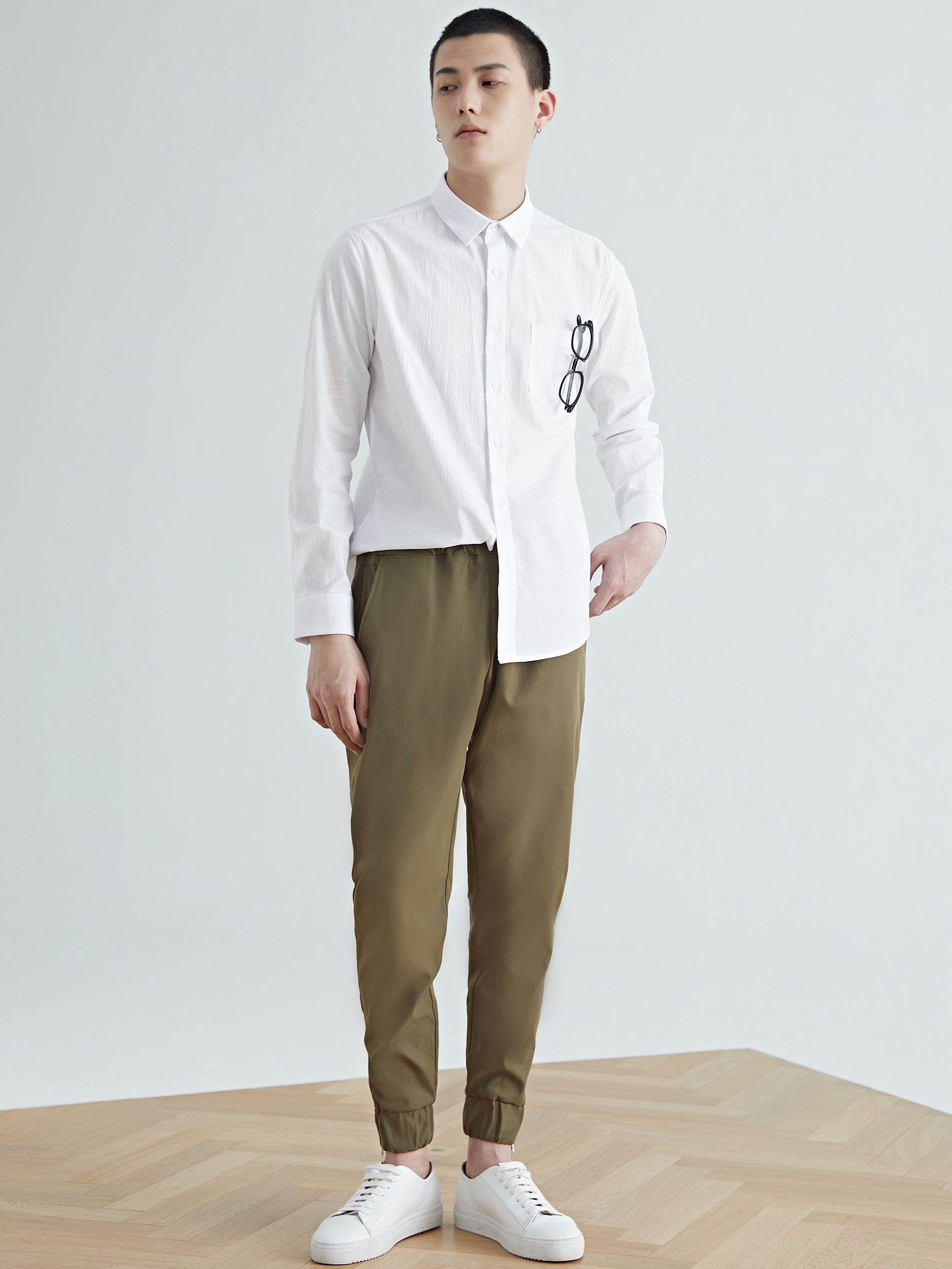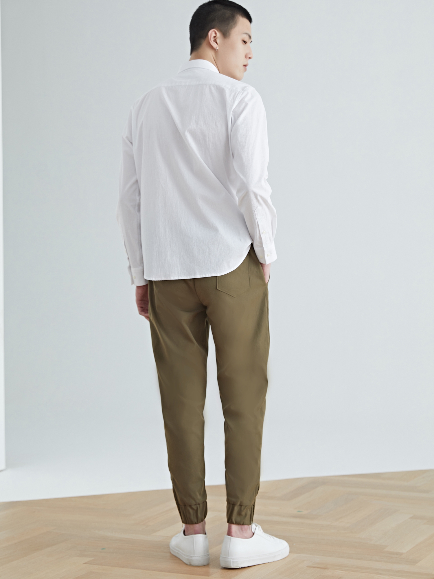 不加任何的印花,纯净的一片纯色带出几分日系复古小清新的味道。辅以宽松的小脚裤版型,减少对双腿的束缚感,带来真空般的清凉透气。