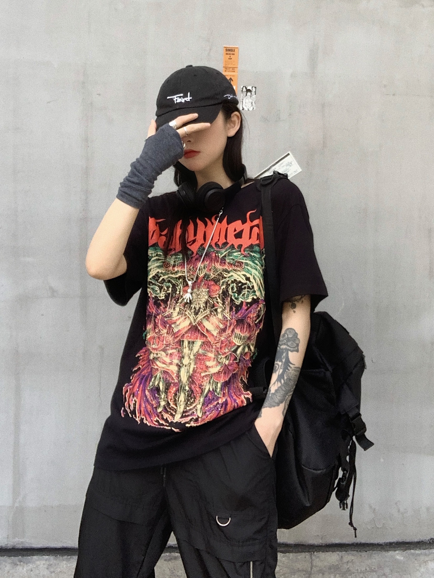时尚潮牌摇滚帝国打造的这款短袖t恤,在酷黑主色的烘托渲染下,倍显神秘潮酷,充满暗黑朋克风尚气息。