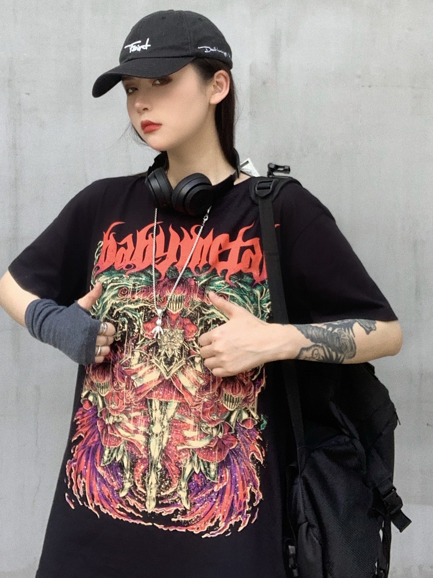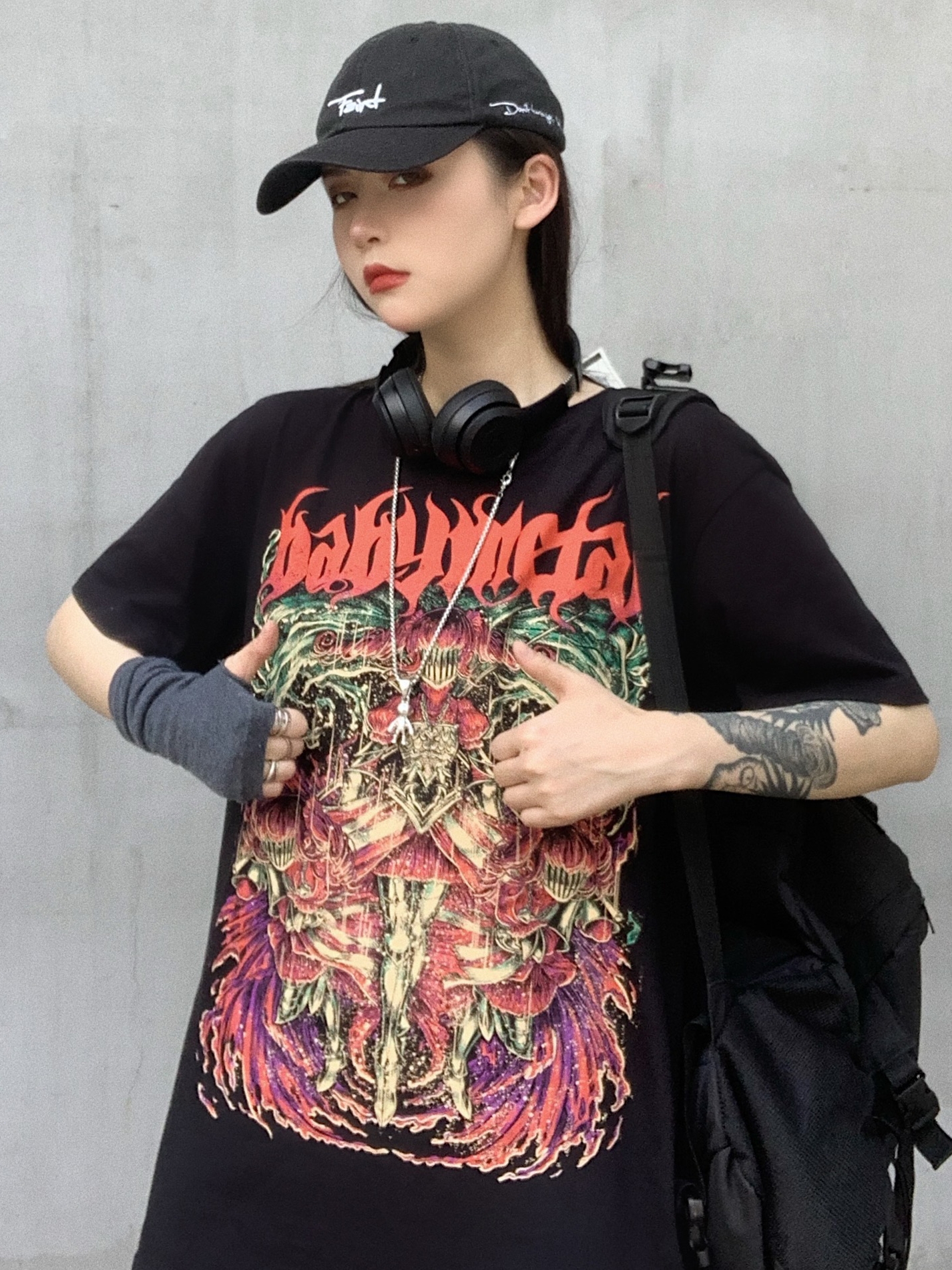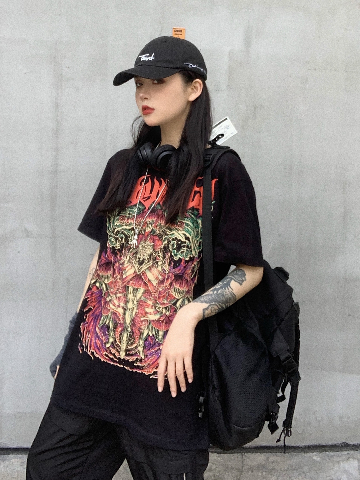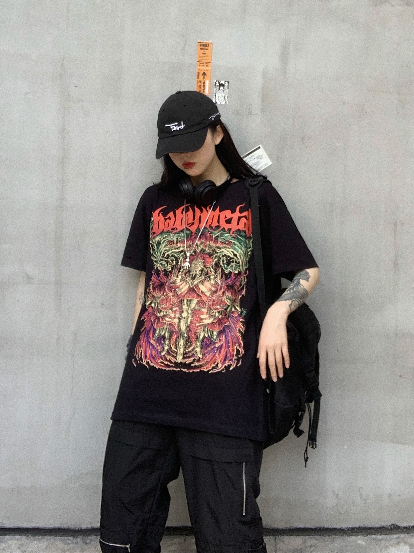印花融入魔法阵、火焰图纹与骷髅头元素设计,呈现出极具冲击力效果的画面,展现叛逆摇滚态度。