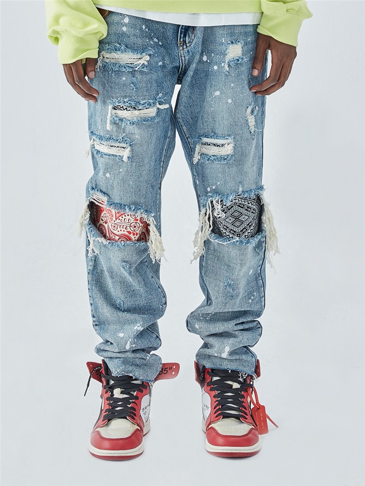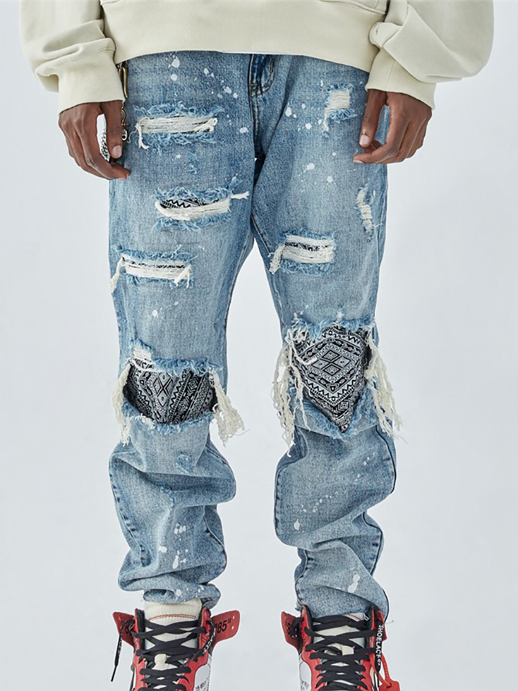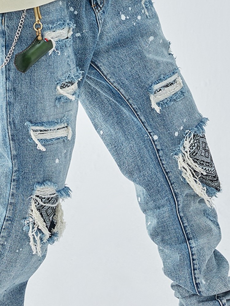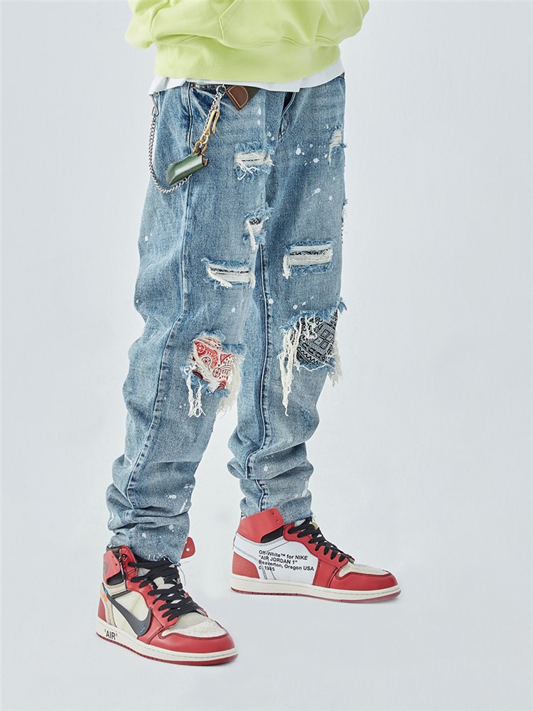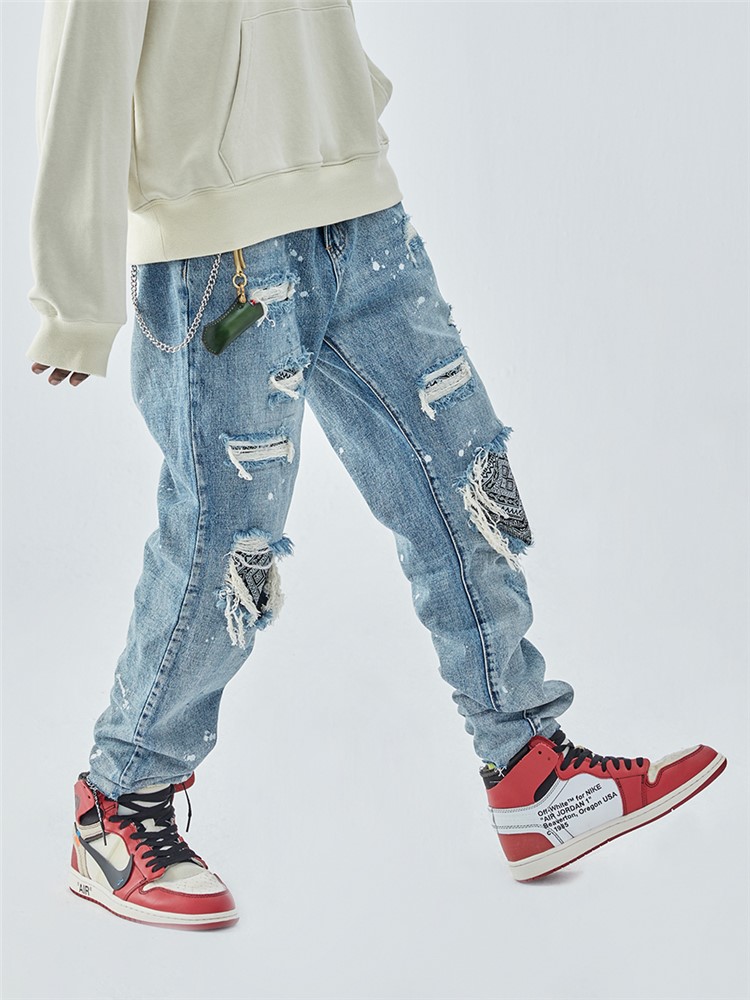 这款牛仔裤采用了水洗工艺,手感柔软舒适,穿着亲肤透气,裤身的破洞设计,个性十足,彰显个性,破洞的设计更显潮流,搭配一件T恤,尽显潮男魅力。
