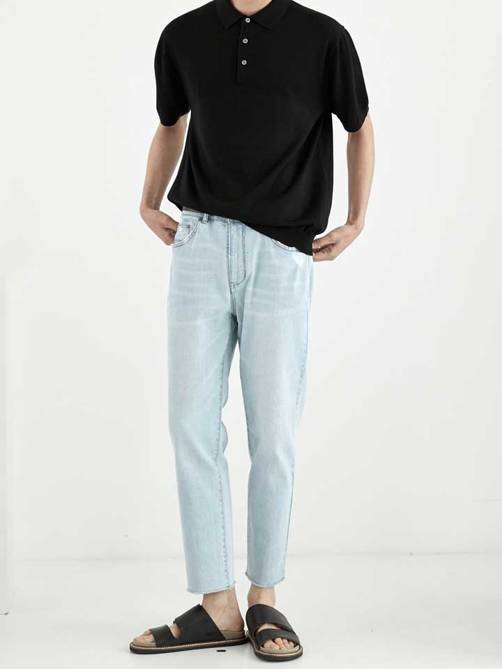 颇具少年清新感的牛仔裤,巧妙的运用轻破坏的毛边设计脚口。带来复古做旧的感觉。文艺感十足。