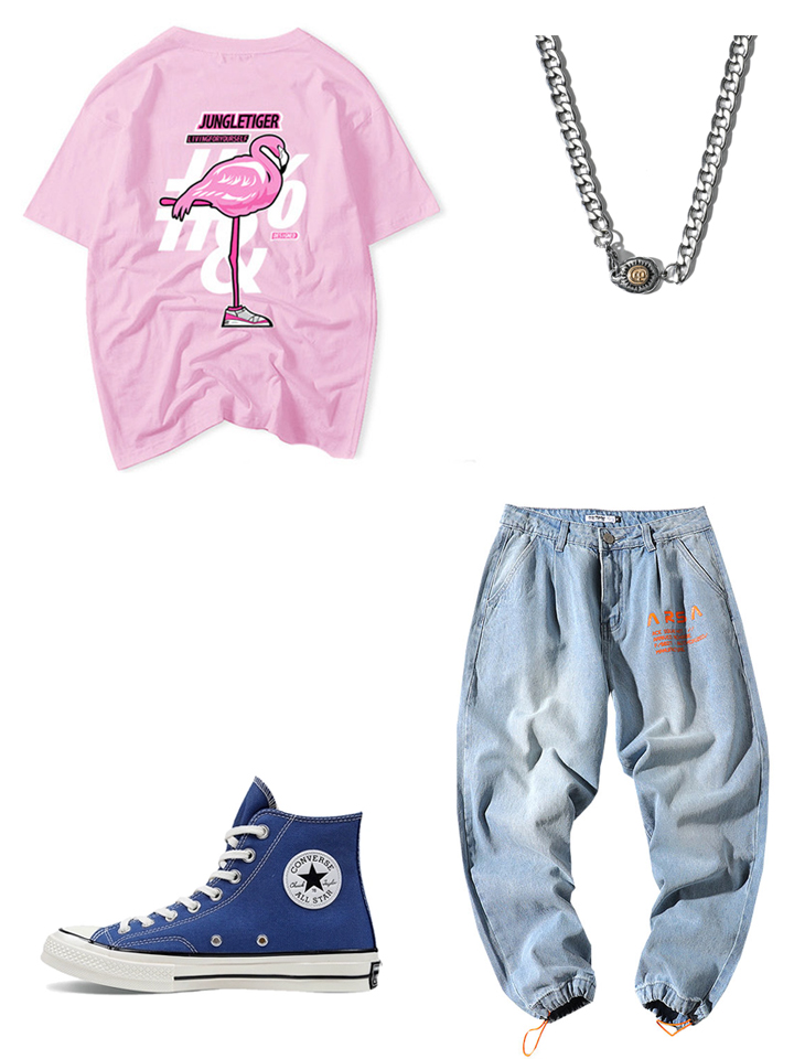 今年超流行的粉色系T恤,加上火烈鸟印花的点缀,显得格外吸睛,搭配蓝色牛仔裤和蓝色帆布鞋,尽显青春减龄的穿搭魅力,回头率满满。