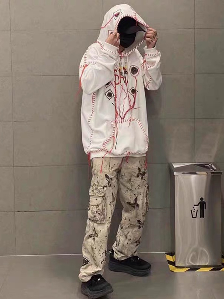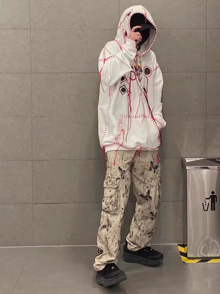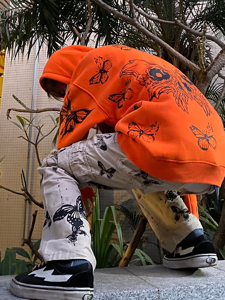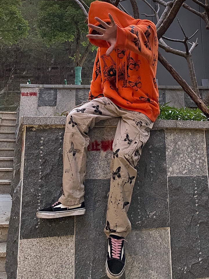 泼墨蝴蝶工装裤搭配上休闲卫衣和板鞋,时尚的穿搭风格尽显街头嘻哈气息!