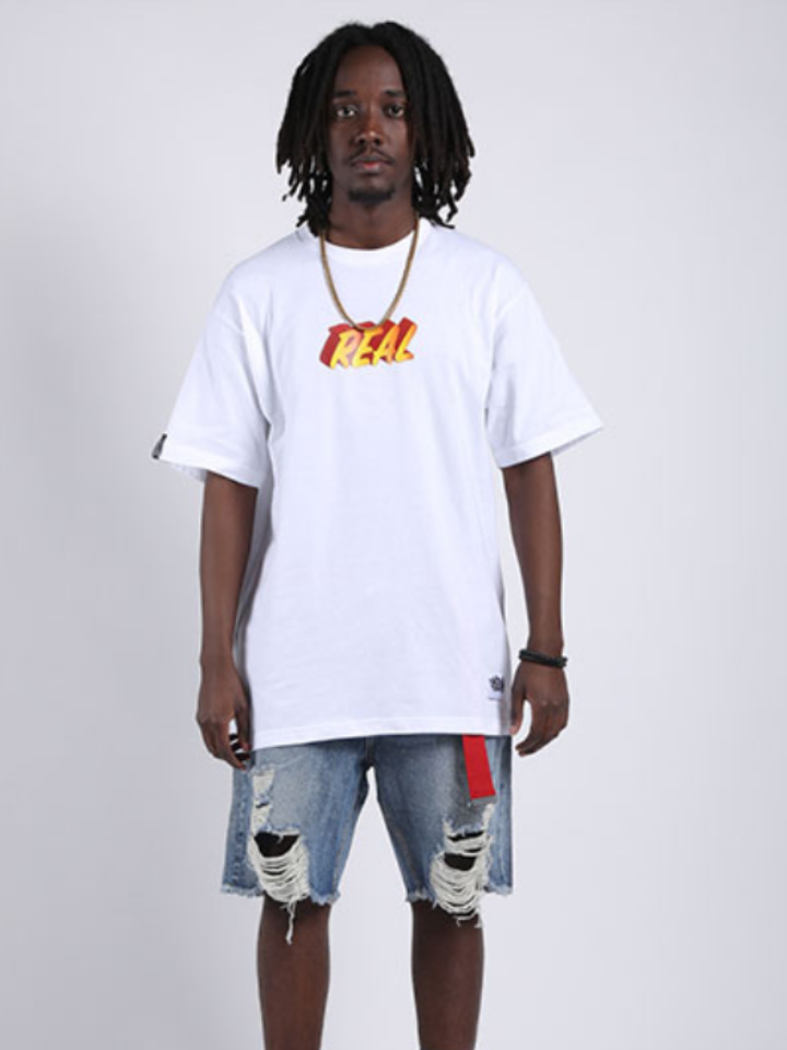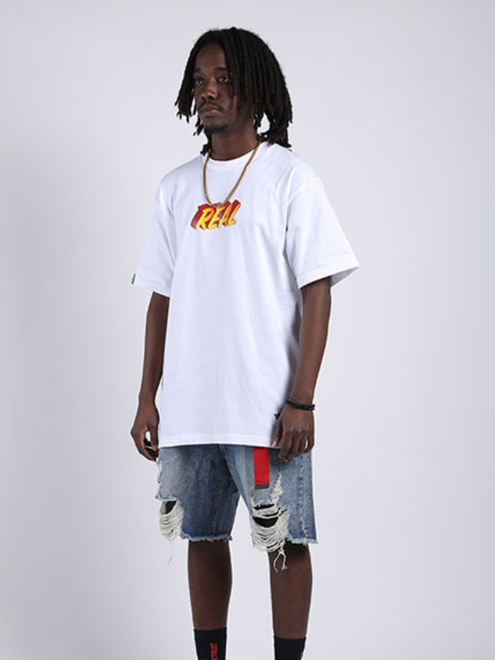 白色基调的T恤非常百搭,下身搭配一条时髦的破洞短牛仔裤,蓝白色的经典搭配处理,打造时尚的街头嘻哈风范。