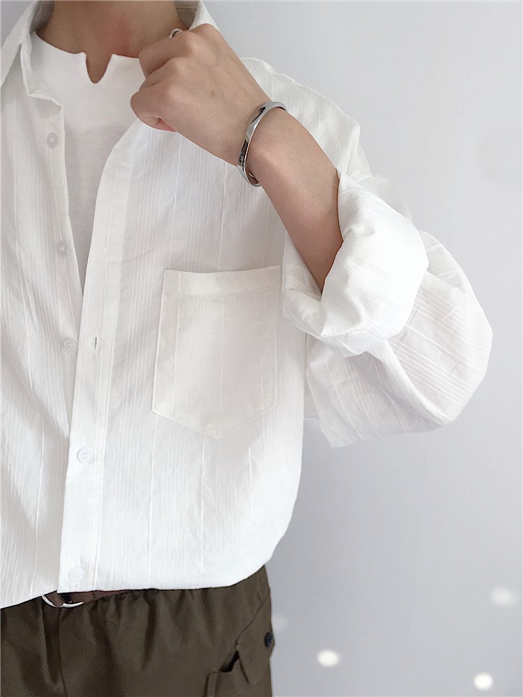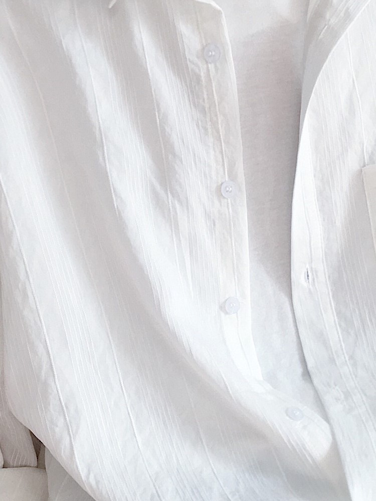 做工精细,彰显品质魅力,白色的色调,简约又百搭,纯色的色调,简约又百搭,衬衫翻领,修饰颈部线条。