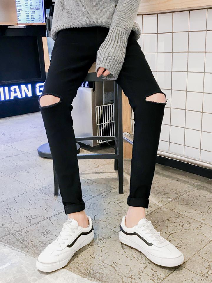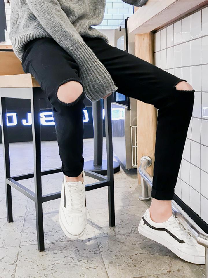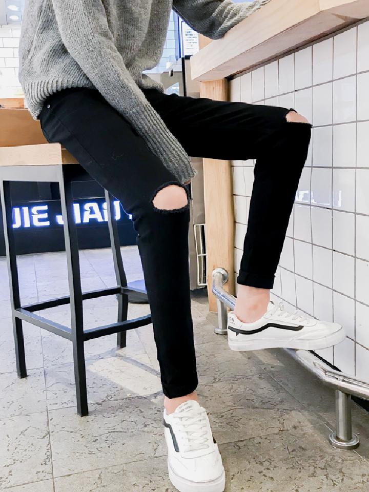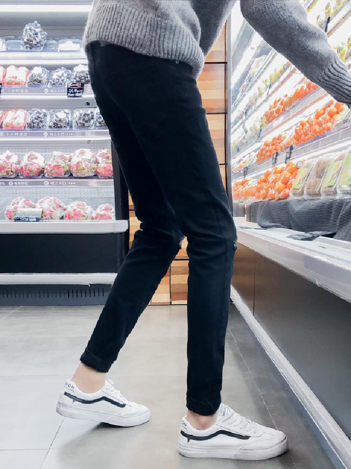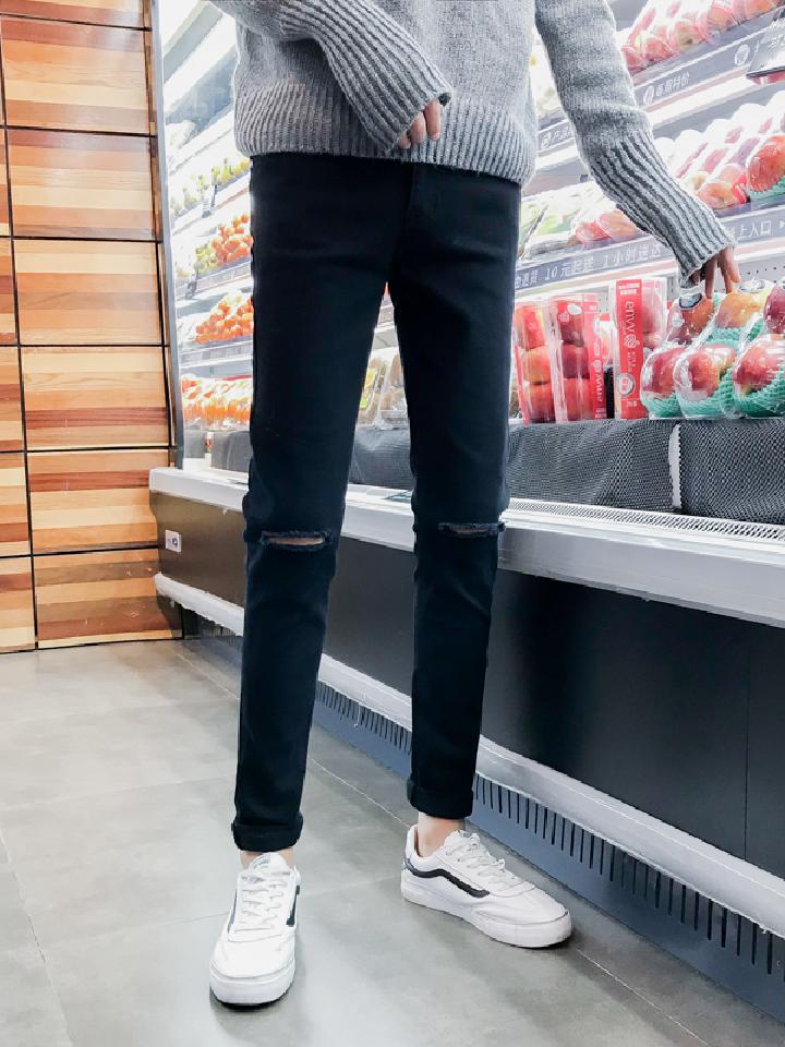韩版潮流修身小脚英伦青年破洞牛仔裤九分裤男此款牛仔裤洗水风格自然洛色,显得个性而不张扬,款式百搭,设计独特的破洞风格。