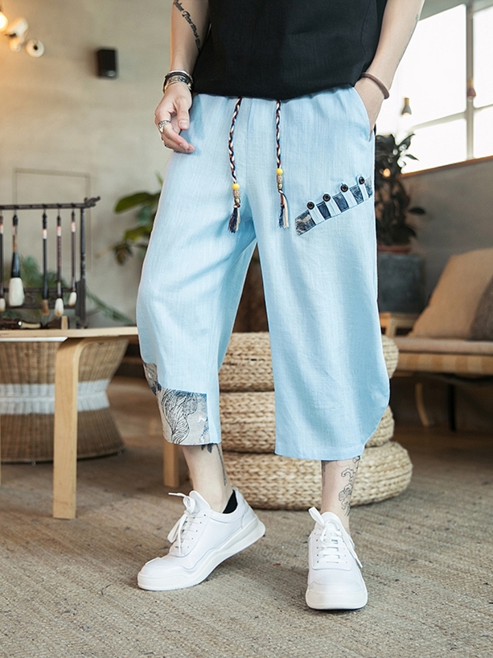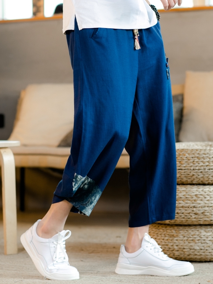 懒人的松紧腰设计,个性复古真皮抽绳用料,没有其他多余设计和装饰的,纯色简约风范。清爽棉麻面料,舒适透气,夏天穿着更惬意。宽松七分小脚裤型,轻松修饰腿型。
