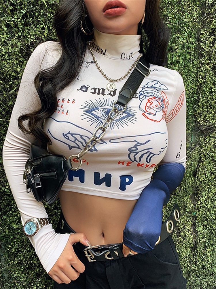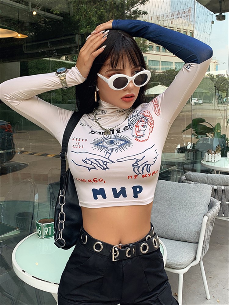 长袖设计,修饰手臂曲线,可拆卸,可随意变换造型,高领设计,修饰颈部线条,宽松T恤,穿着舒适自在,个性印花设计,时尚潮流。
