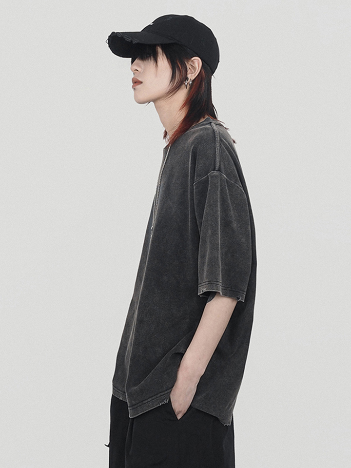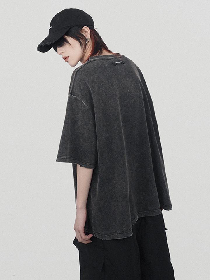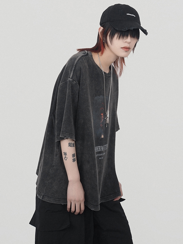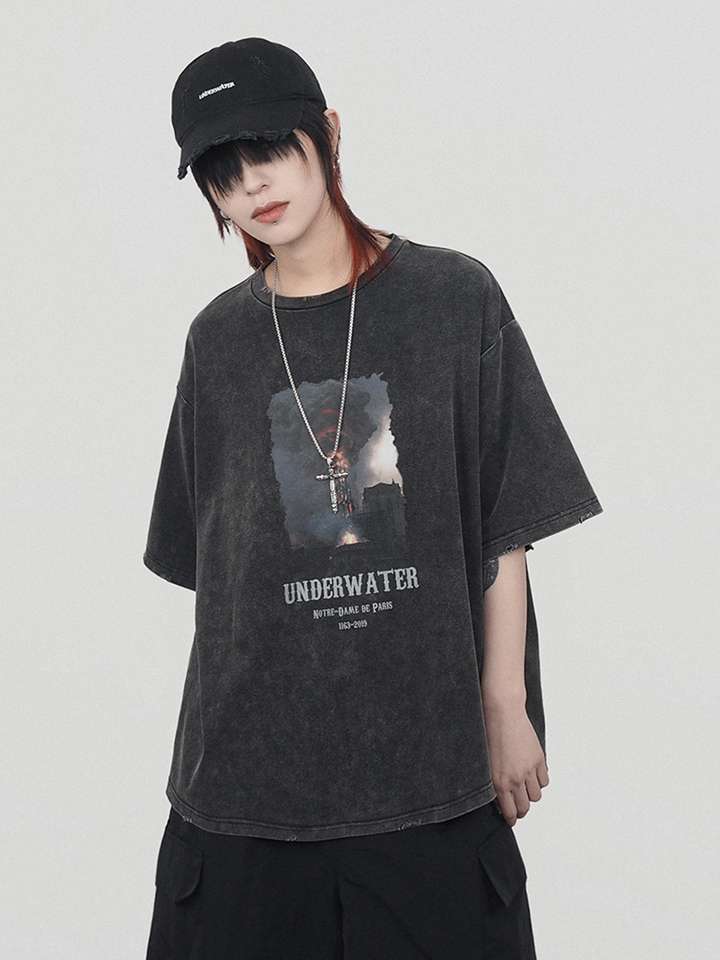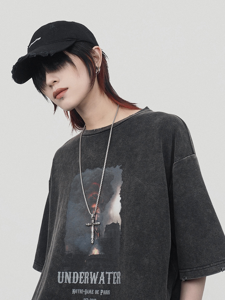 这款t恤采用做旧的方式,袖子边缘的破损更有设计感。中间画有巴黎圣母院被烧的历史画面,很有年代感和历史感。