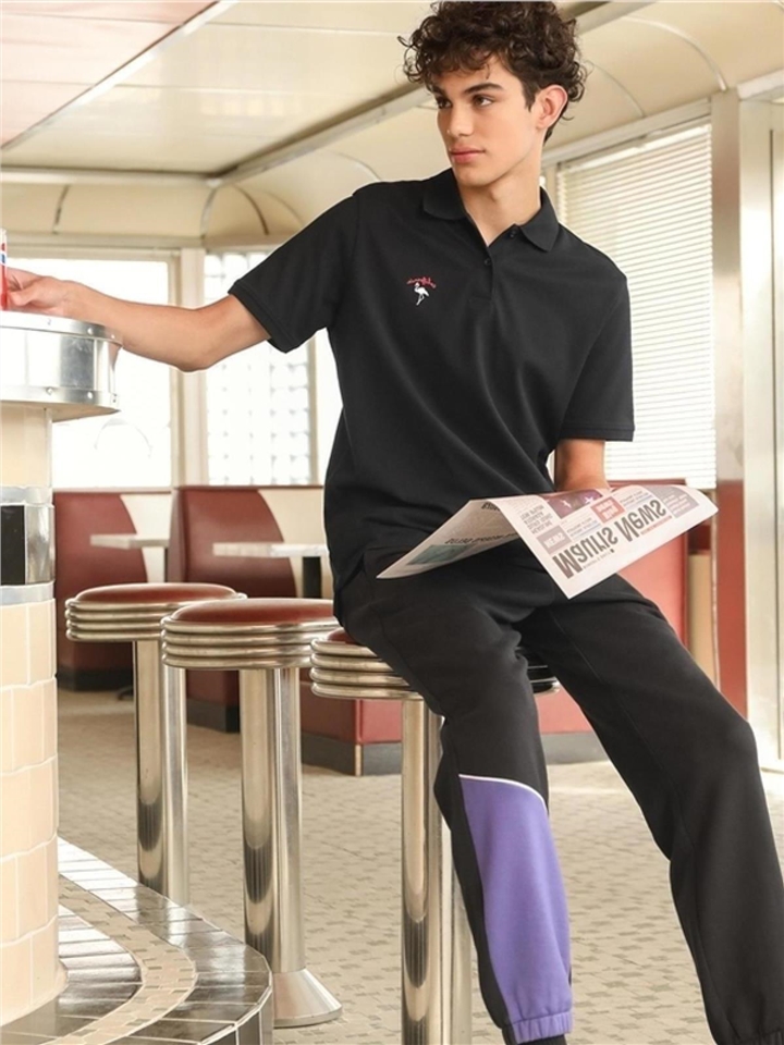 黑色的色调,经典又百搭。短袖设计,修饰手臂线条。撞色衫设计,时尚不单调。