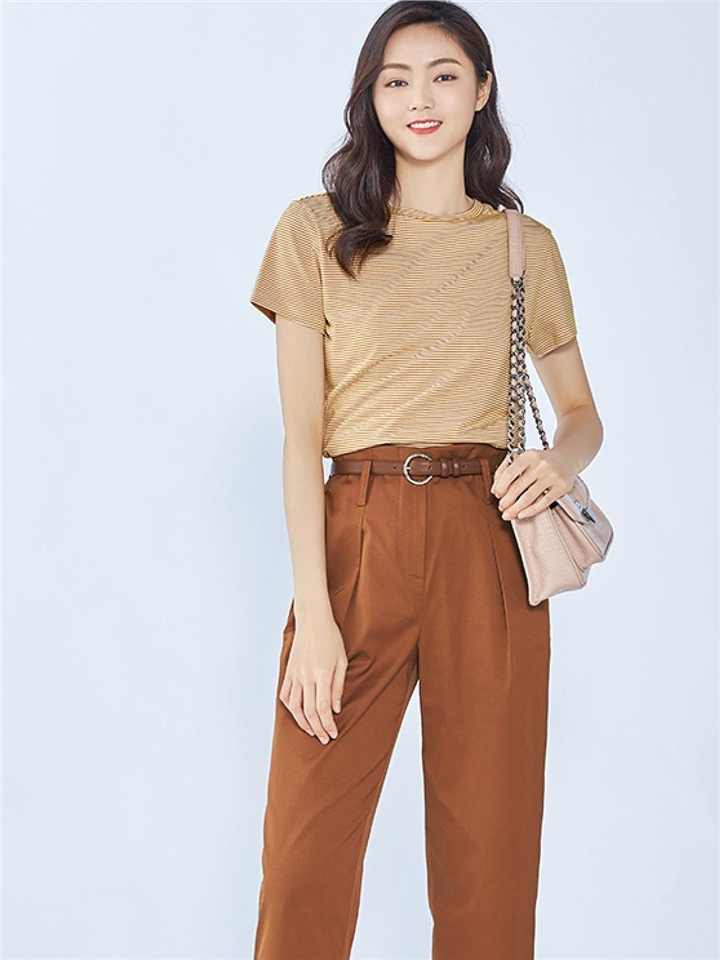 高腰的设计,拉长腿部线条,显瘦效果很好,高腰的版型,很显高挑,修身的剪裁,修饰腿部曲线,上身很有范。