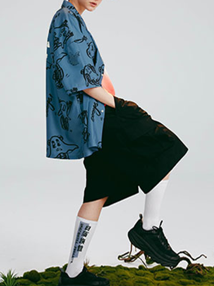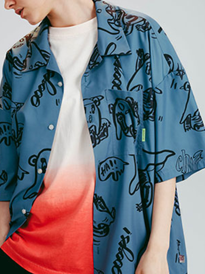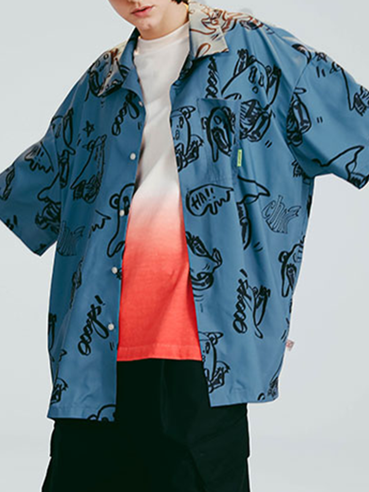 古巴领,简单大气不失休闲感,数码印花,胶印牢靠反复洗水不易脱落,宽松袖口,平整直筒下摆,舒适,不闷热。