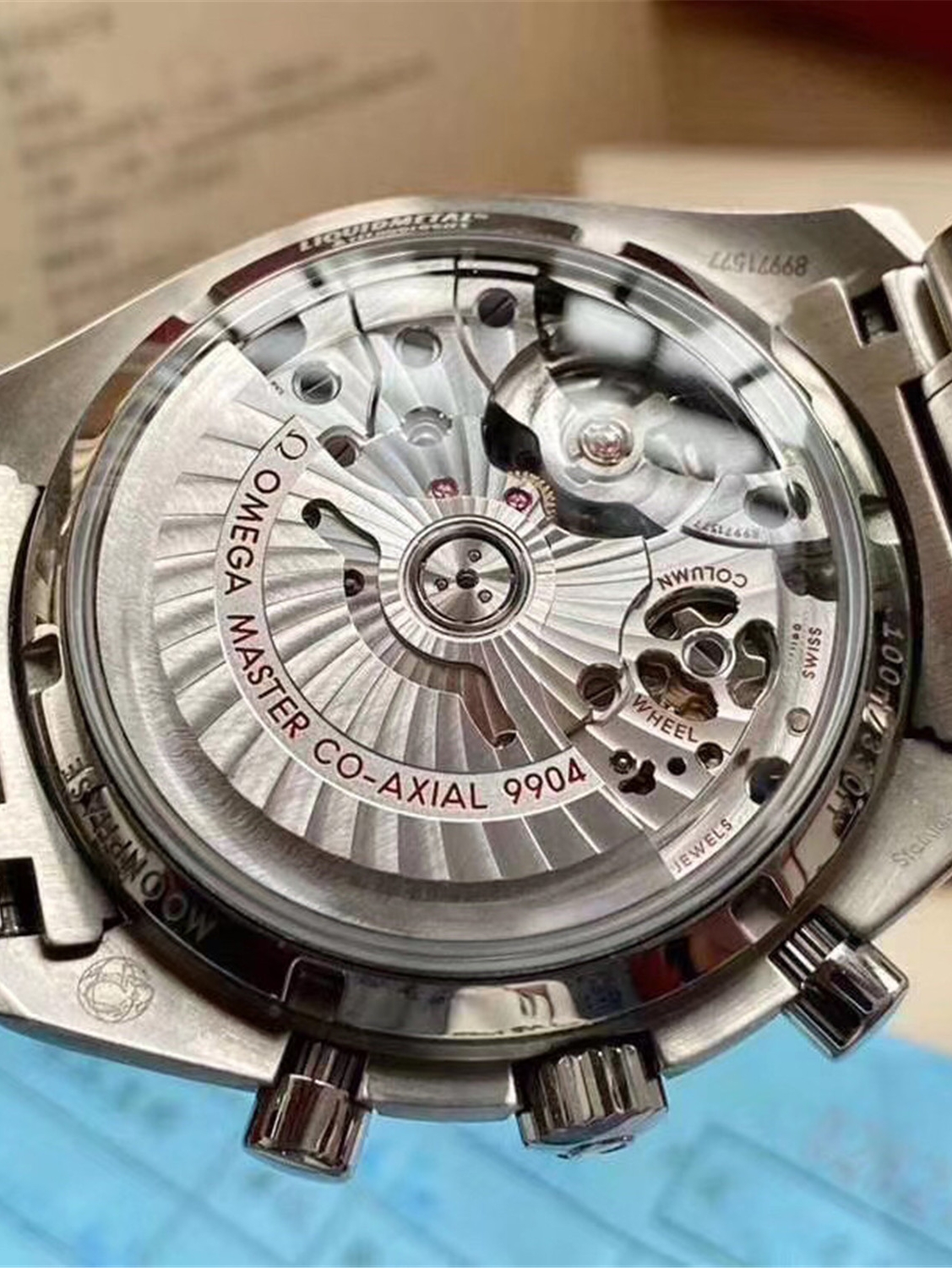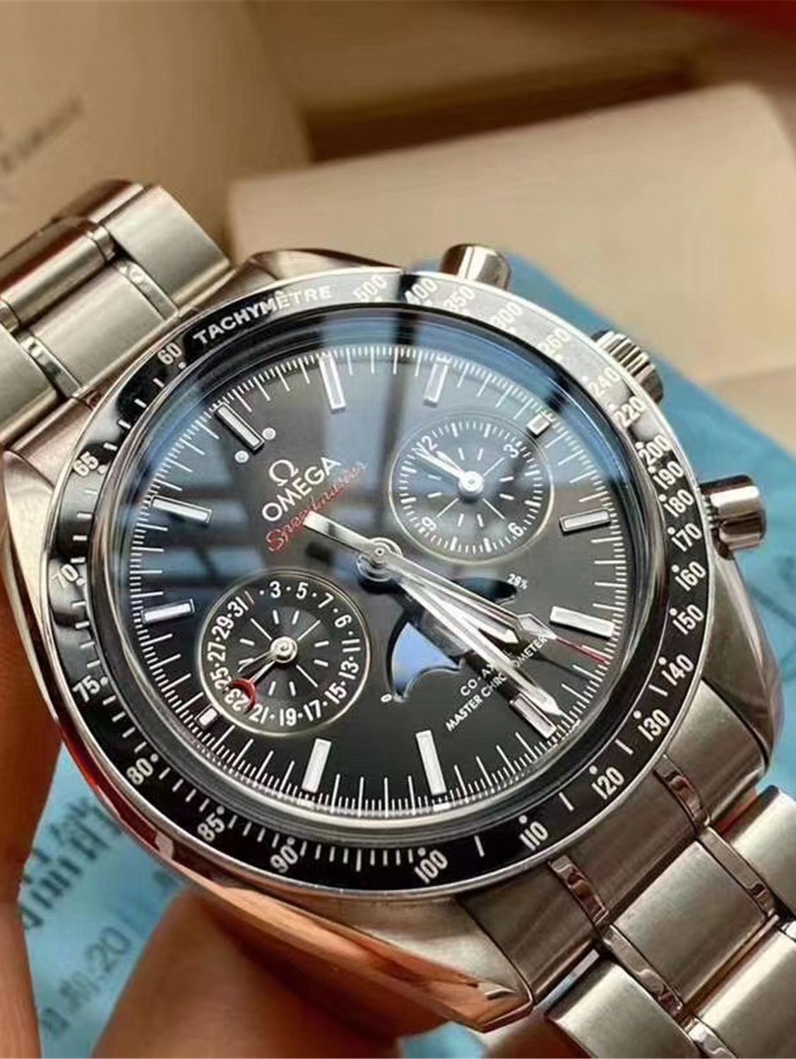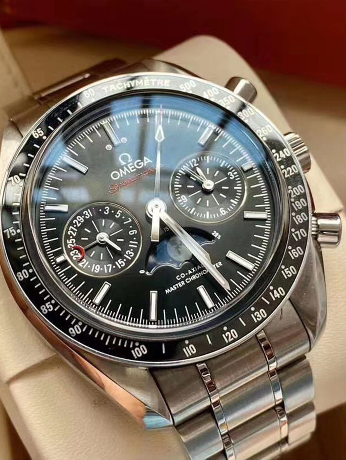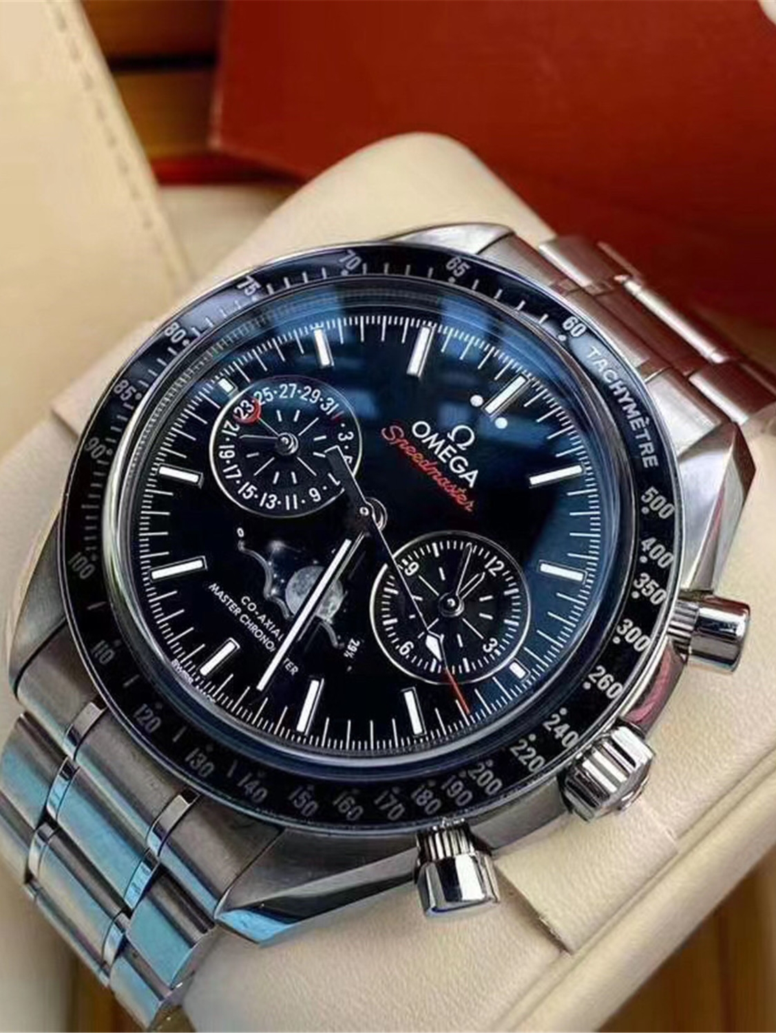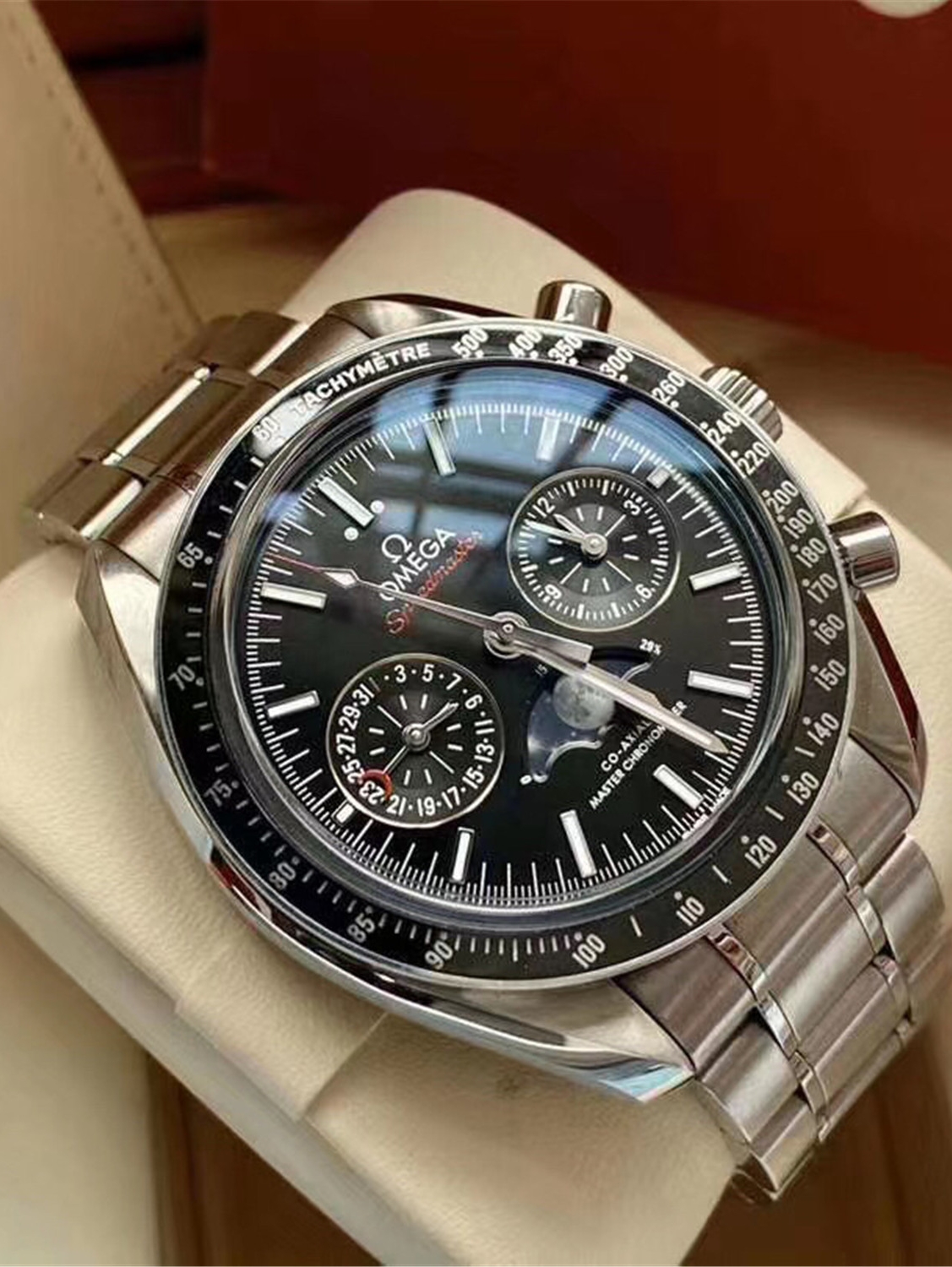 欧米茄超霸系列月相至臻天文台表以精钢表壳搭配黑色陶瓷表圈,采用太阳射线打磨的黑色表盘,上月球影像栩栩如生,可抵御高达15,000高斯的强磁场。