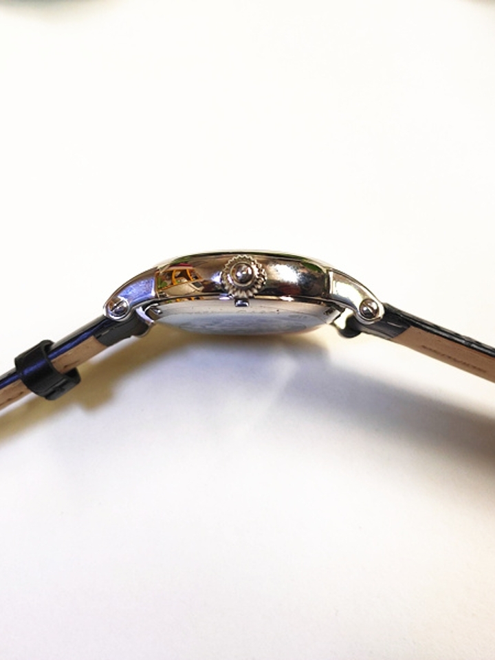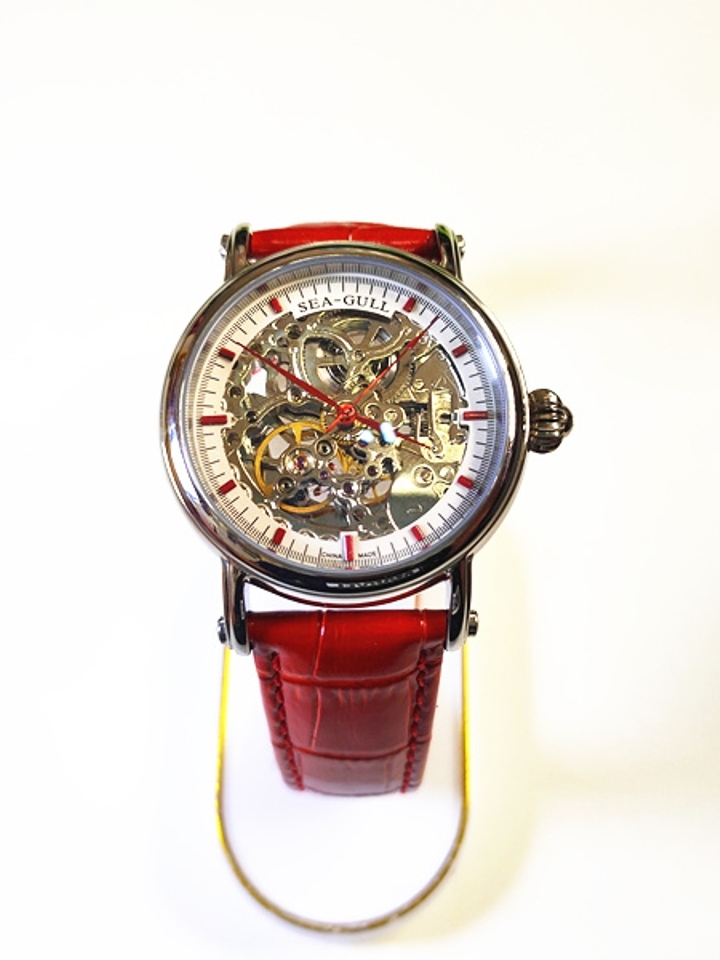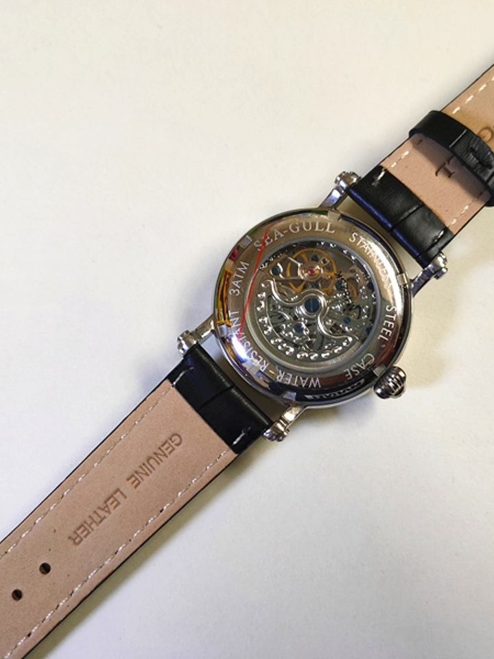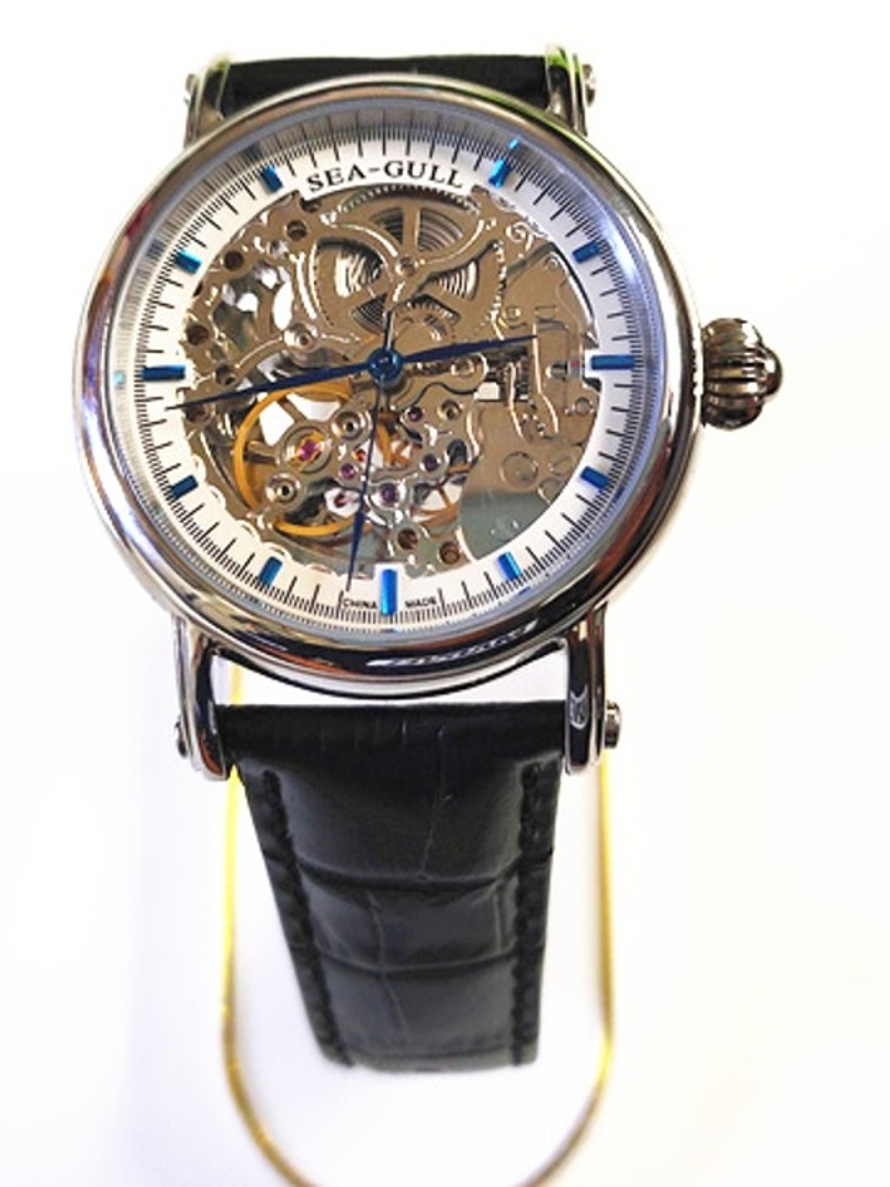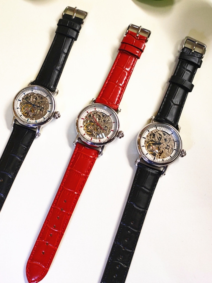 该款手表采用镂空表盘的设计,直接将机芯呈现,能看到机械的运作