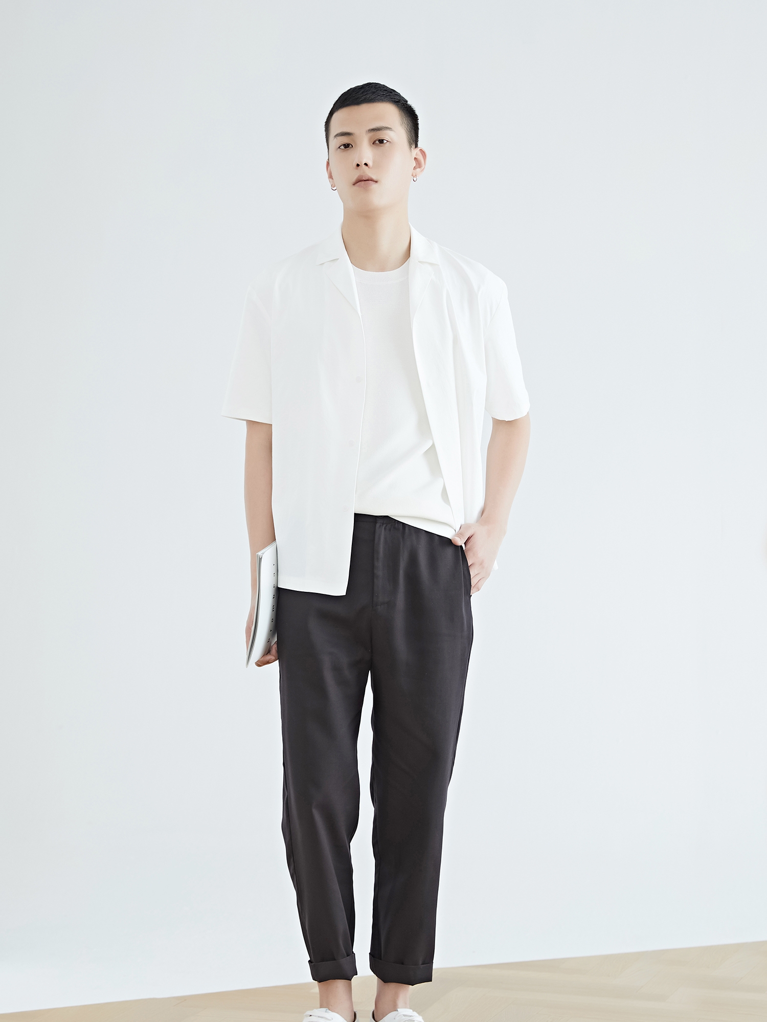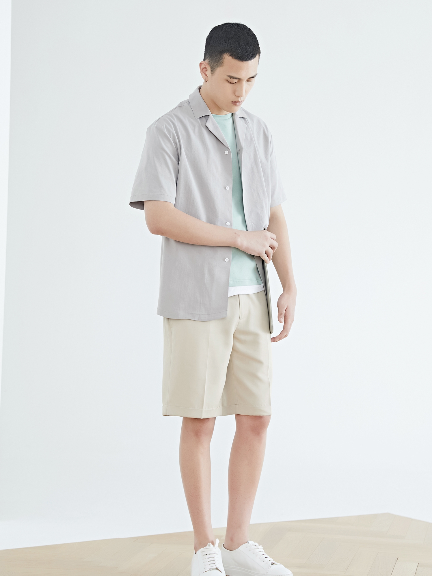 宽松的短袖衬衫版型,街头港风范十足,下身搭配的五分休闲裤和一双小白鞋就能带出满满的摩登气息。