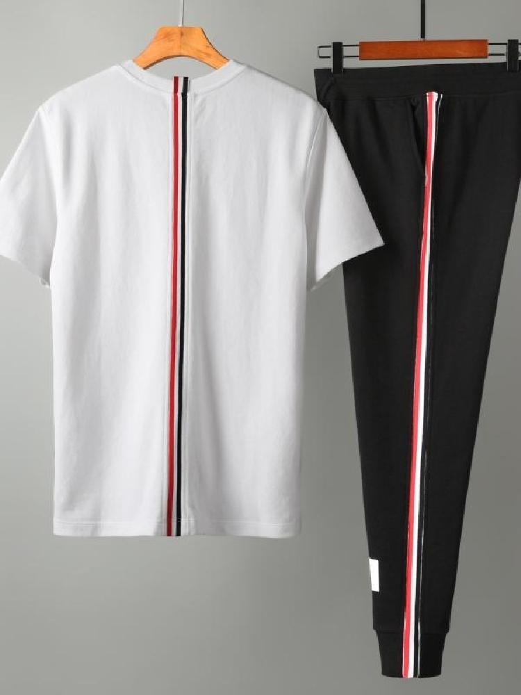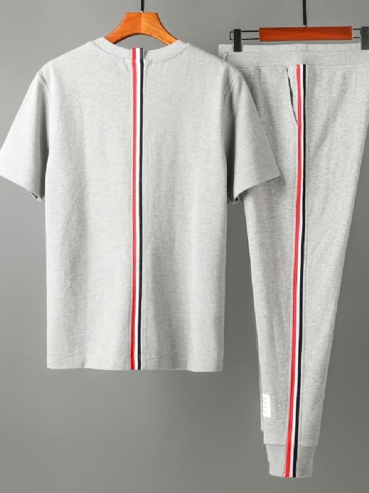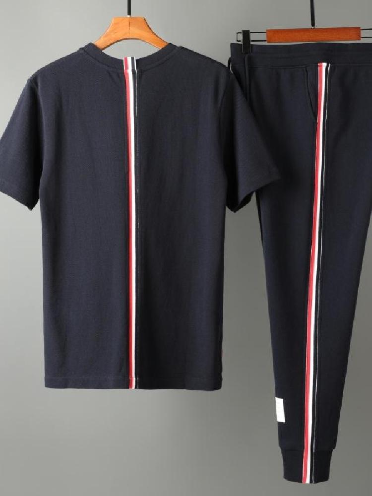 适合运动穿的短袖套装,采用棉质材质,柔软透气,舒适的体感,弹性出色,上身不紧绷,裤腰是松紧系带式的,胖人穿也无压力,拼色搭配条纹图案,风格青春简约,多色可选,喜欢的朋友值得去看看。